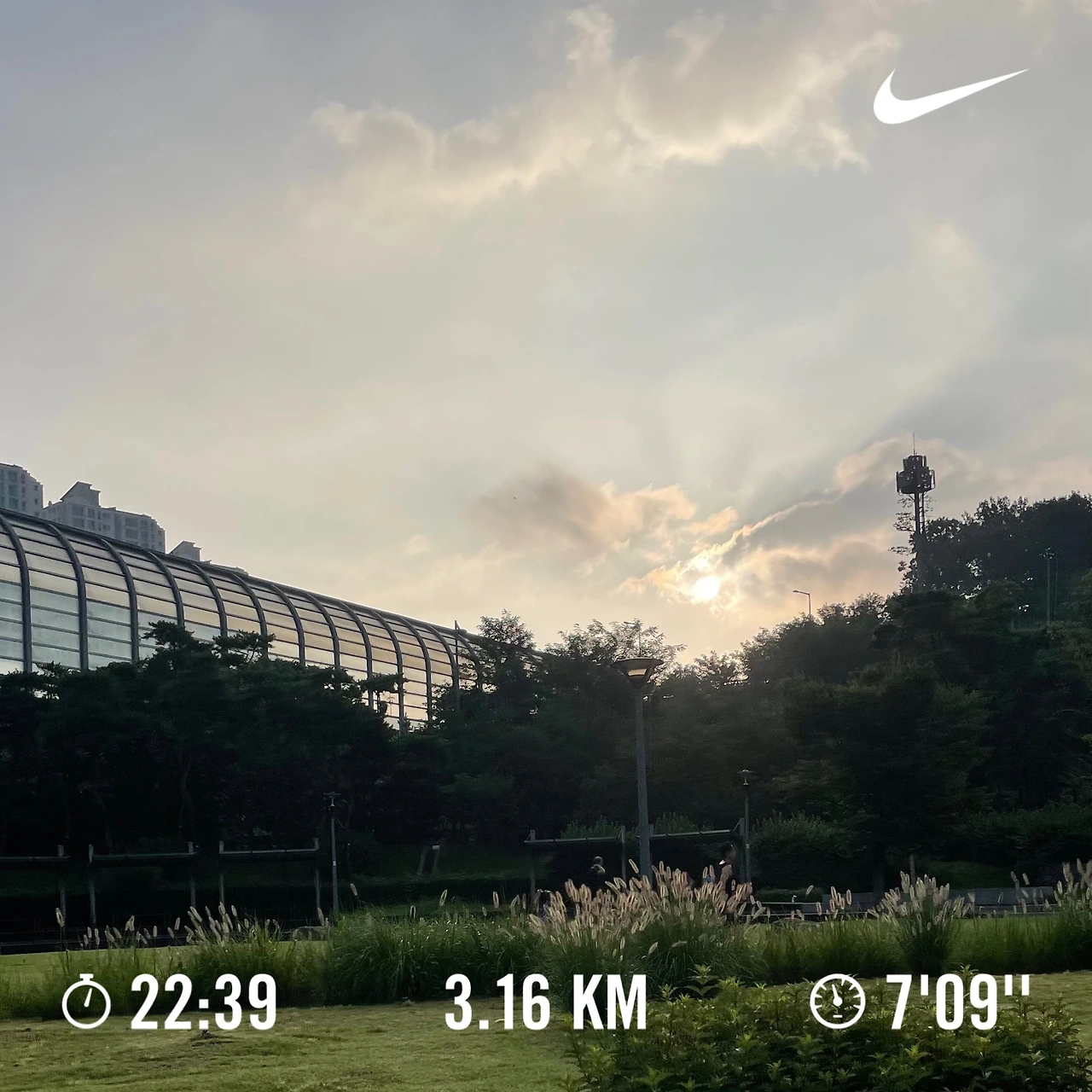 일요일 오전. 6시에 일어나서 4.5km를 목표로 집을 나섰다. 결과는 참패.. 3.16km에서 멈추고 말았다. 중간에 멈추기도 하고.. 일부러 해가 없을 때 덜 더운 시간을 골라 힘들게 일어나 뛰었건만. 이제는 혼자서 4km를 뛰어보려고 노력 중이다.