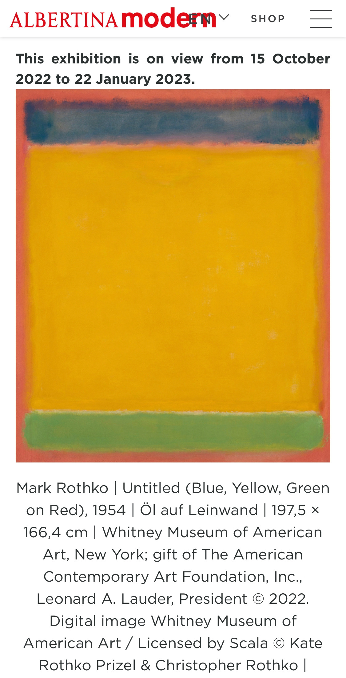 네 번째는 미술관과 다양한 현지 체험..? 이 될 듯한데 이건 아직 미정이다. 미술관은 두 번째 빈에 방문했을 때 둘러보았기 때문이다. 그래도 에곤 쉴레나 자코메티의 작품들은 다시 보고 싶긴 하다. 그러다 전엔 가보지 않았었던 알베르티나 미술관에서 내가 좋아하는 '마크 로스코'의 특별전을 한다는데 이건 꼭 가볼 생각이다. 마크 로스코의 작품들은 꼭 실물로 봐야지 제 맛이다. 그리고 팬데믹 이후로 유명 작품들이 국내로 들어오는 수가 적어졌기 때문에 이런 기회는 흔치 않다. 특히 마크 로스코는 미국에 작품들이 많을 것 같은데.. 당분간 내가 미국을 갈 일은 없으니 ㅎㅎ 어쨌든 나는 행운아다.