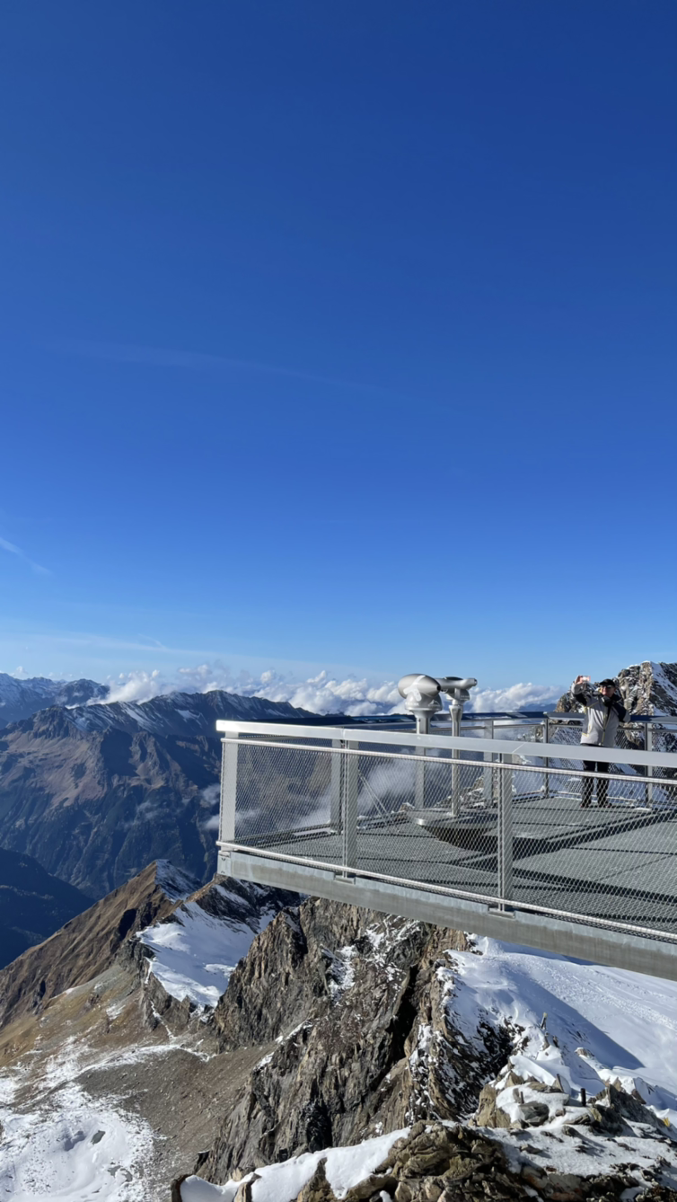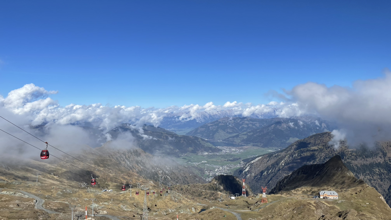 버스를 타고 가는 사람보다 렌터카를 빌려 스키장비와 함께 오르는 사람들이 많았다. 첫 번째 케이블카를 탔는데 속도가 생각보다 빨라서 놀랐다. 10여분 정도 지나서 첫 번째 지점에 내렸다. 눈은 없지만 높이 올라와 작은 마을들이 보이는 게 신기했다. 다만 고소공포증이 있는 사람은 키츠슈타인호른까지 가는데 꽤 무서울 것 같다. 케이블카 속도도 빠르고 고지대니..