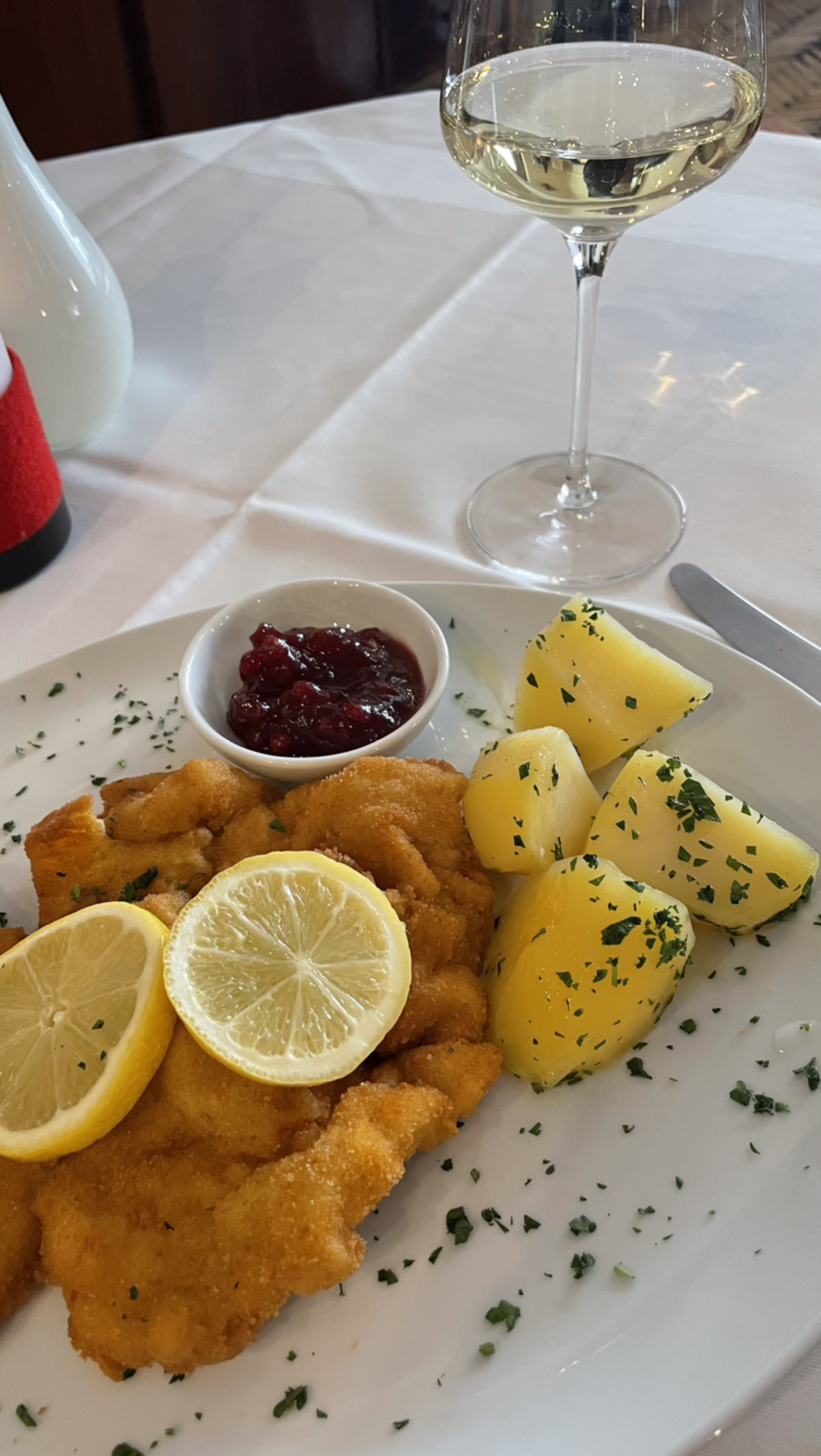아침 조깅을 하고 배가 고파 슈니첼로 점심을 먹어보기로 했다. 비엔나 맛집이라는 피그뮐러를 예약까지 했는데 여차저차 타이밍이 맞지 않아 취소하고 슈니첼을 먹지 못 했었다. 사실 이전에 빈에 왔을 때 먹어 본 슈니첼이 별로였기 때문에 큰 욕심도 없었다. 그러다 첼암제 레스토랑에서 슈니첼과 리슬링 와인을 먹게 되었는데..