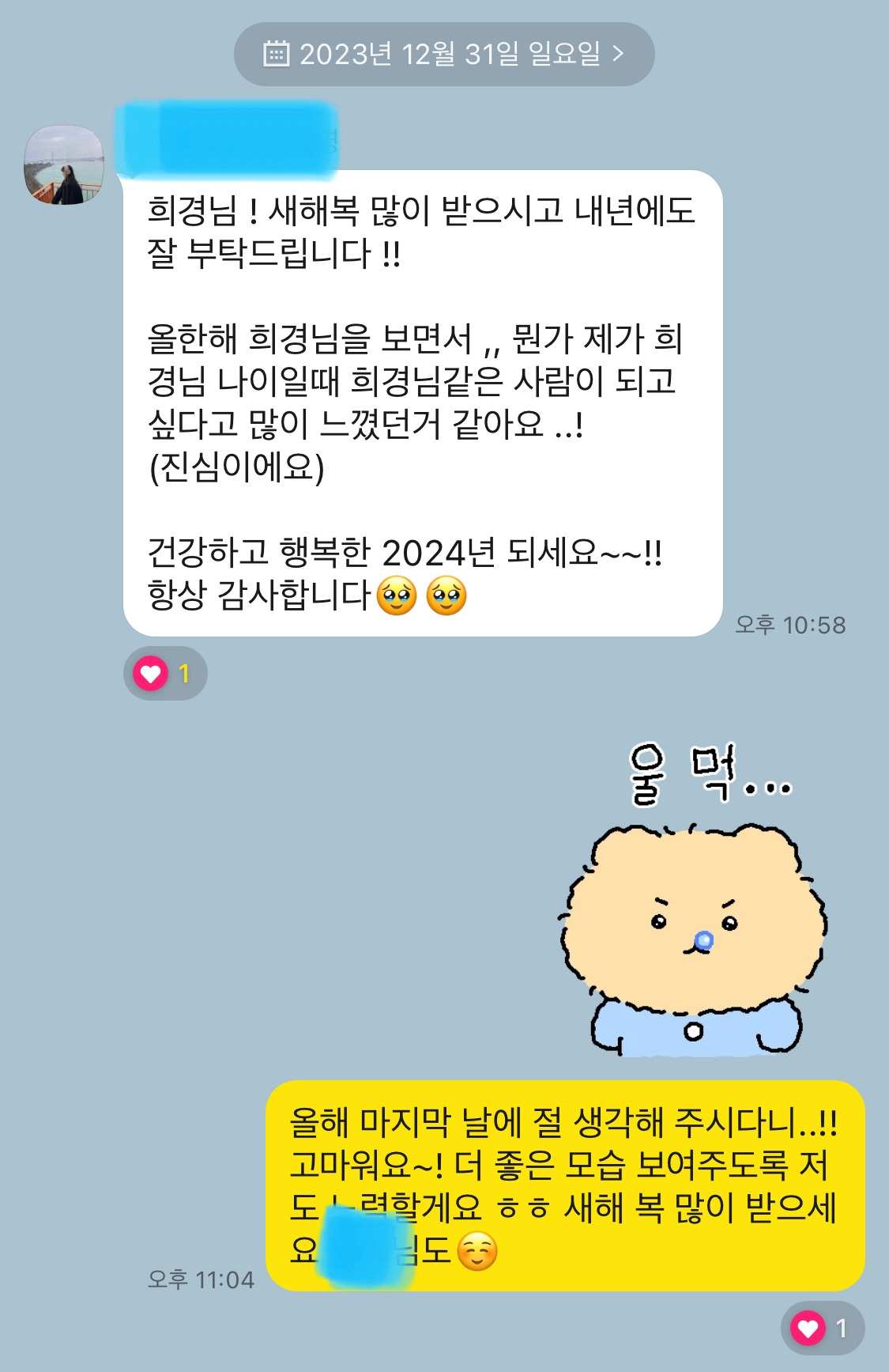 새해를 기다리며 텔레비전을 시청하는데 카톡 소리가 들려 휴대폰을 켰다. 팀원 중 가장 막내팀원에게 온 카톡이었다.
