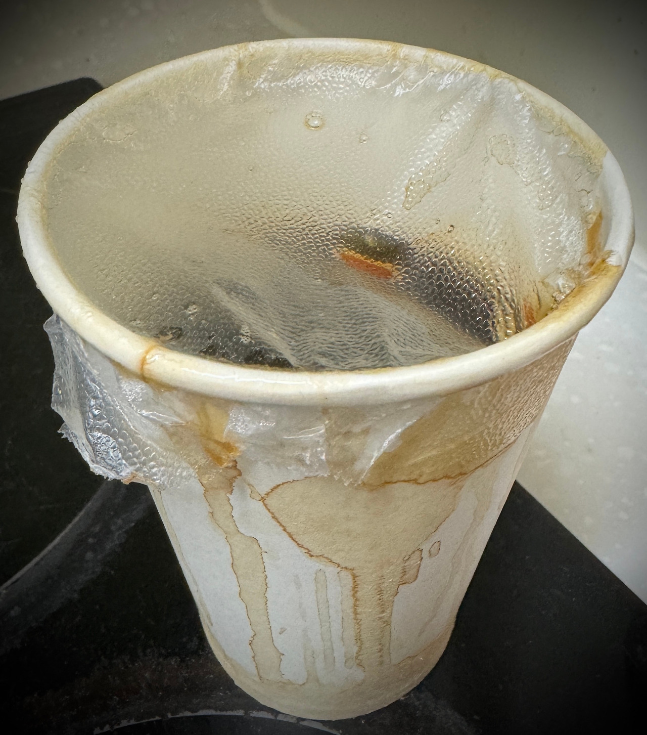 '앞에 놓고 간다고 전화하는 건가? 꼼꼼한 사람이네.' 하며 그러려니 하고 전화는 받지 않았다. 현관문을 빼꼼 열어 빵 봉지와 커피를 안으로 들이는데 그제야 왜 배달 기사가 전화했는지 이유를 알 수 있었다. 커피가 넘쳐 종이컵이 얼룩덜룩 되어 있었고, 뚜껑을 열자 1/3의 커피가 사라져 있었다.