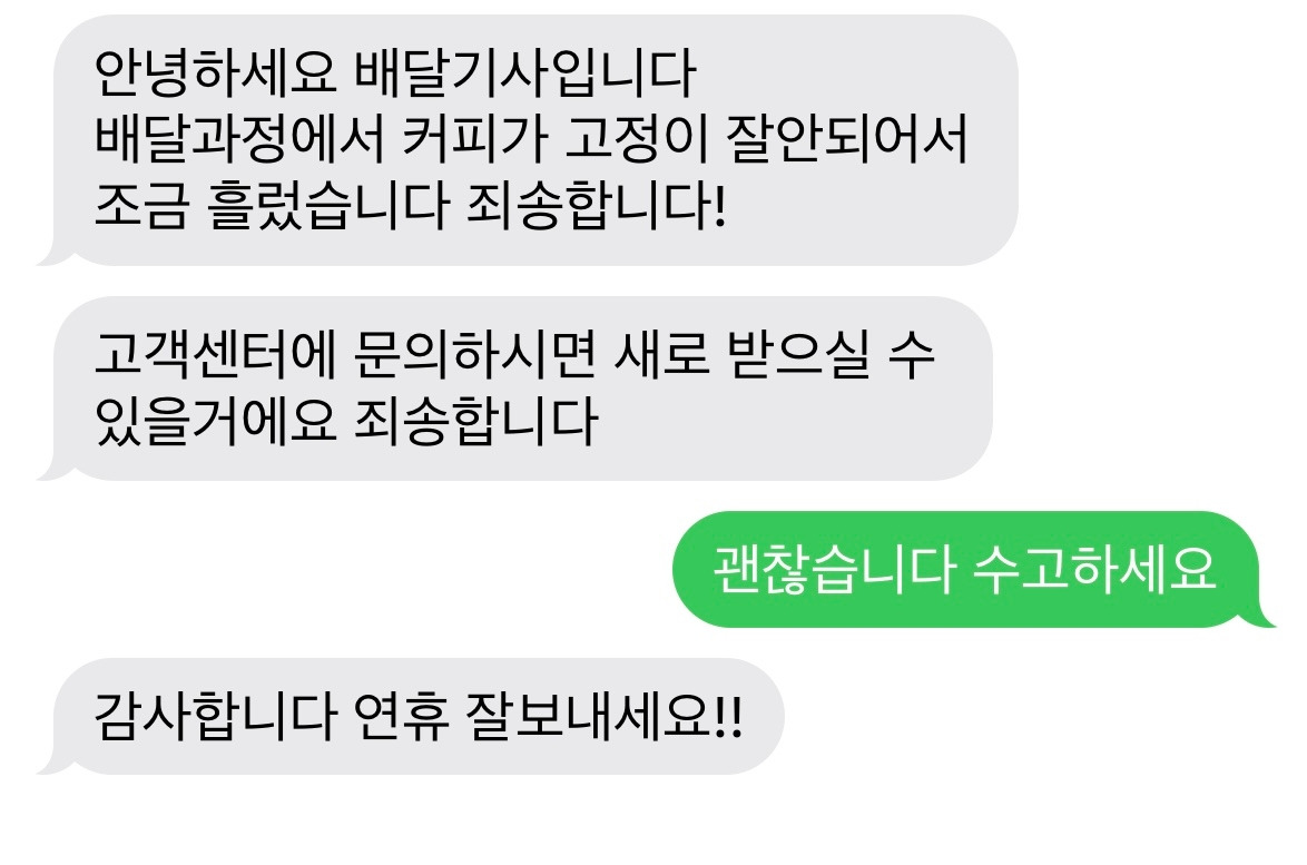'아… 커피 괜히 시켰네' 생각하고 있는데 문자가 왔다. 커피가 쏟아져서 죄송하다는 배달 기사의 문자였다. 고객센터에 연락하면 다시 요청하실 수 있다고 거듭 사과 문자를 보내왔다. 평소 배달이 완료됐다는 문자가 와도 번호가 노출될까 봐 답문하지 않는데 괜찮다는 이야기를 해주고 싶었다.
