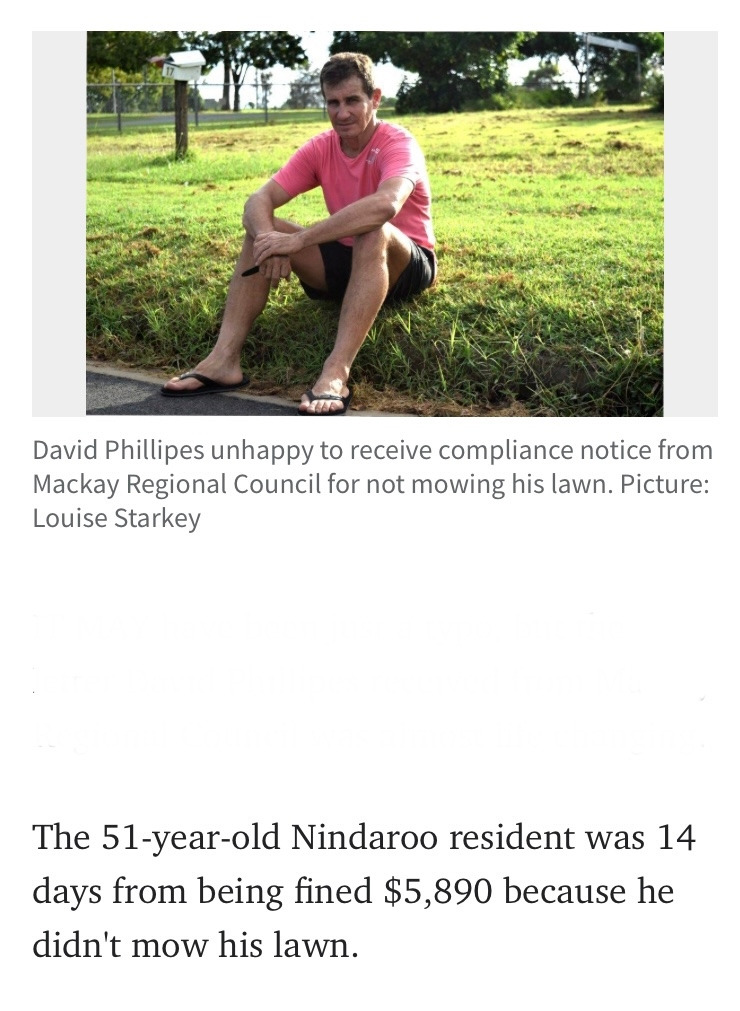 좀 더 살벌한 곳에서는 잔디 깎지 않는 이웃을 신고하기도 한다고 한다. 잔디를 제때 안 깎으면 벌금을 내기 때문이다. 호주 사람들은 좀 오지랖이 넓고, 준법정신들이 워낙 투철해서 딱히 그 사람에 대한 특별한 감정 없이도 법에 저촉되면 그냥 신고해 버리는 수가 많다. 그 '꼴'을 잘 못 보는 사람들이 많다. 그래서 심심치 않게 잔디를 제때 안 깎아 엄청난 벌금 테러를 당했다는 기사를 보곤 한다.