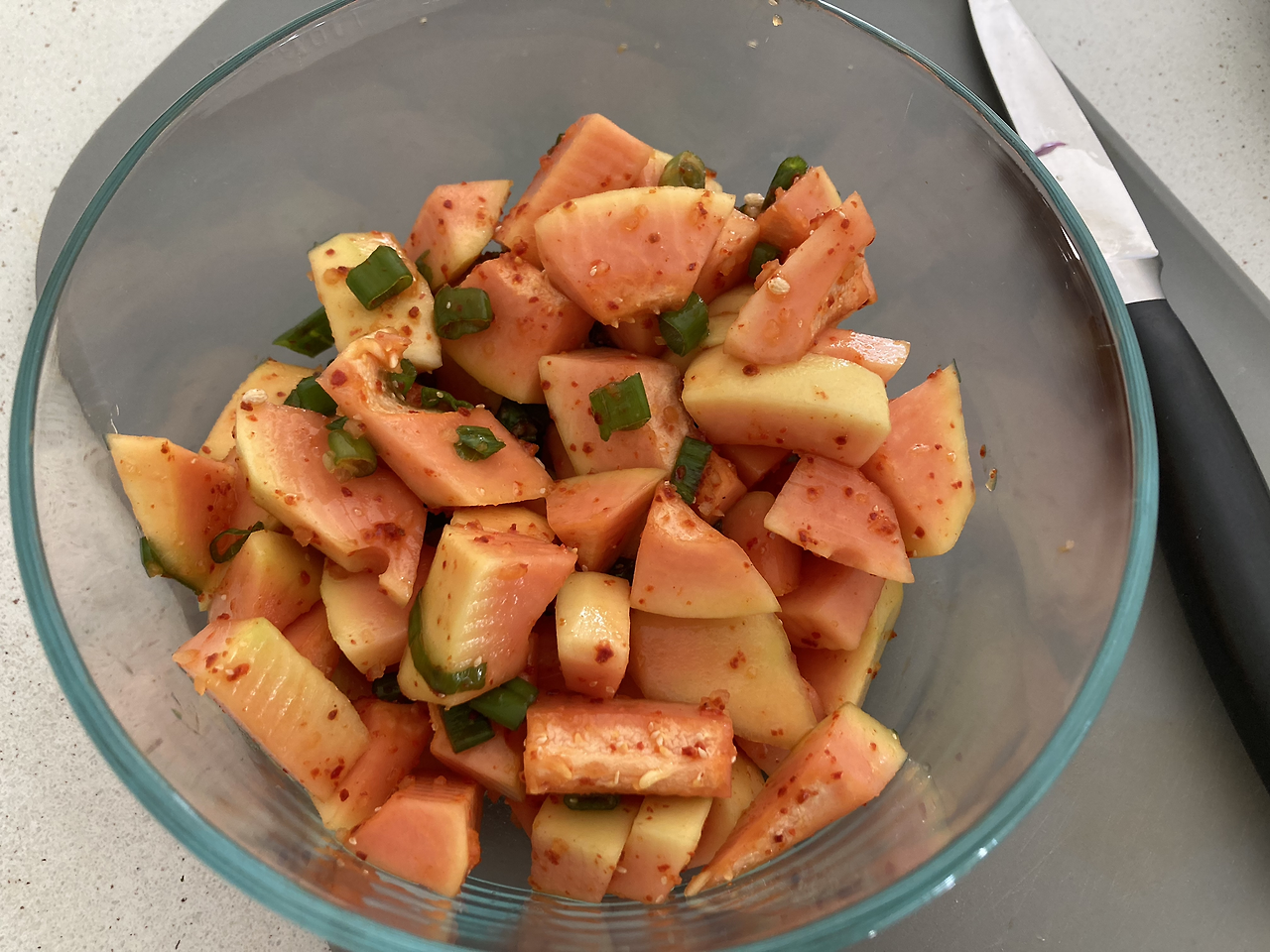 구아바는 다 익어 잘라보니 안이 선홍색이다. 구아바 주스는 먹어봤어도 진짜 구아바는 처음이다. 단단하고 작은 씨들이 많아 먹기가 불편하지만, 과육은 부드럽고 달았다. 노란빛으로 변한 바나나 하나를 따 먹어보니 새콤달콤한 바나나맛이다. 레이디 핑거라고 불리는 바나나라 새콤한 맛이 돈다. 몰랑몰랑 잘 익어 너무 맛있다. 바나나 한 개를 네 식구가 사이좋게 나눠 먹었다. 파파야는 아직 익지 않아 익을 때까지 기다리려 했는데, 호기심 많은 둘째 녀석이 파파야를 잘라버렸다. 겉과는 달리 안은 붉은색으로 변해가고 있었다. 씹어보니 제법 단 맛이 돈다. 하지만 과육이 너무 단단해 과일로 먹기에는 무리가 있다. 그래서 자른 김에 파파야 김치를 담았다. 작게 썰어 액젓과 고춧가루, 파, 마늘을 넣고 무치니 뚝딱 파파야 김치가 되었다. 설탕으로 맛을 내지 않고, 본연의 단맛이 나는 파파야 김치가 너무 맛있다.