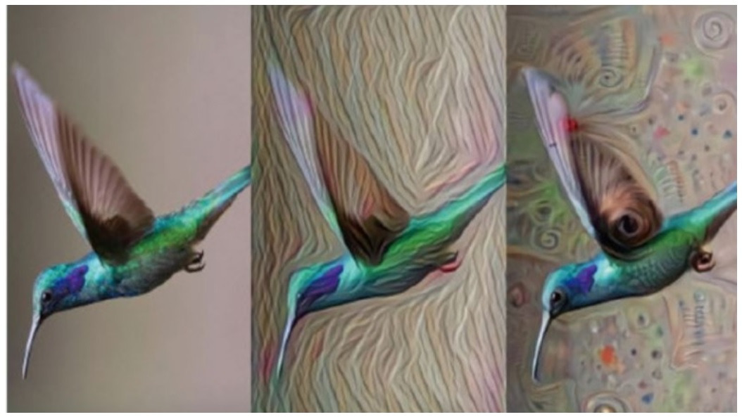 인공지능에 새의 이미지(아래 이미지 맨 왼쪽)를 입력하면 알고리즘을 거쳐 새로운 이미지(아래 이미지 가운데)가 나오게 됩니다. 쉽게 말해 알고리즘은 먼저 이미지 속에 담긴 요소를 하나하나 쪼갭니다. 그다음에 물체를 인식하기 위한 특정 패턴을 찾고 그 패턴을 분석하여 자신이 인식한 대로 결과가 나타나도록 이미지를 조작하고 왜곡합니다. 이런 식의 변형 작업을 통해 새로운 이미지(아래 이미지 맨 오른쪽)를 창조해내는 것입니다. 결과적으로 알고리즘을 거치면 기존의 단조로웠던 새의 이미지는 빈 공간을 원과 선으로 재해석한 다양한 패턴의 이미지로 바뀌게 되는 것입니다.