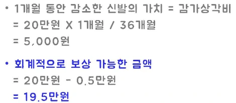 어느 무더운 여름날에 철수는 부모님을 모시고 유명한 삼계탕 집에 갔다. 무더운 여름날이어서 그런지 사람들로 많이 북적북적되었다. 맛있게 식사를 마치고 나서 보니 철수의 신발이 신발장에서 사라지게 된 것을 알게 되었다. 혹시나 하는 마음에 철수는 손님들이 다 빠져나가기를 기다렸지만, 여전히 신발을 찾을 수 없었다. 철수는 가게 주인에게 찾아가서 이럴 경우 어떻게 해야 하는지 물어봤더니, 가게 주인이 미안하다고 하면서 쿨~하게 5만 원을 선뜻 건네주는 것이다. 철수는 왠지 억울한 생각이 든다. 왜냐하면 철수가 잃어버린 신발은 구입한 지 채 한 달이 되지 않았고, 구입 가격 또한 20만 원이기 때문이다. 과연 회계에서는 이런 경우 식당에서 잃어버린 신발을 얼마로 책정하는 게 적정할까?