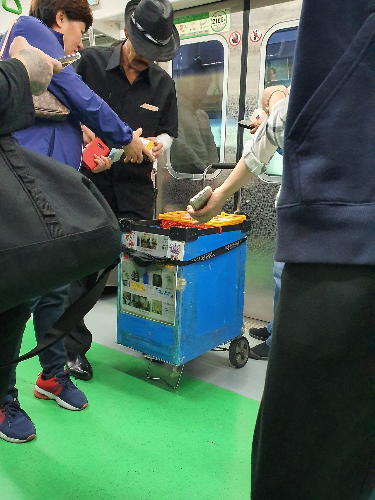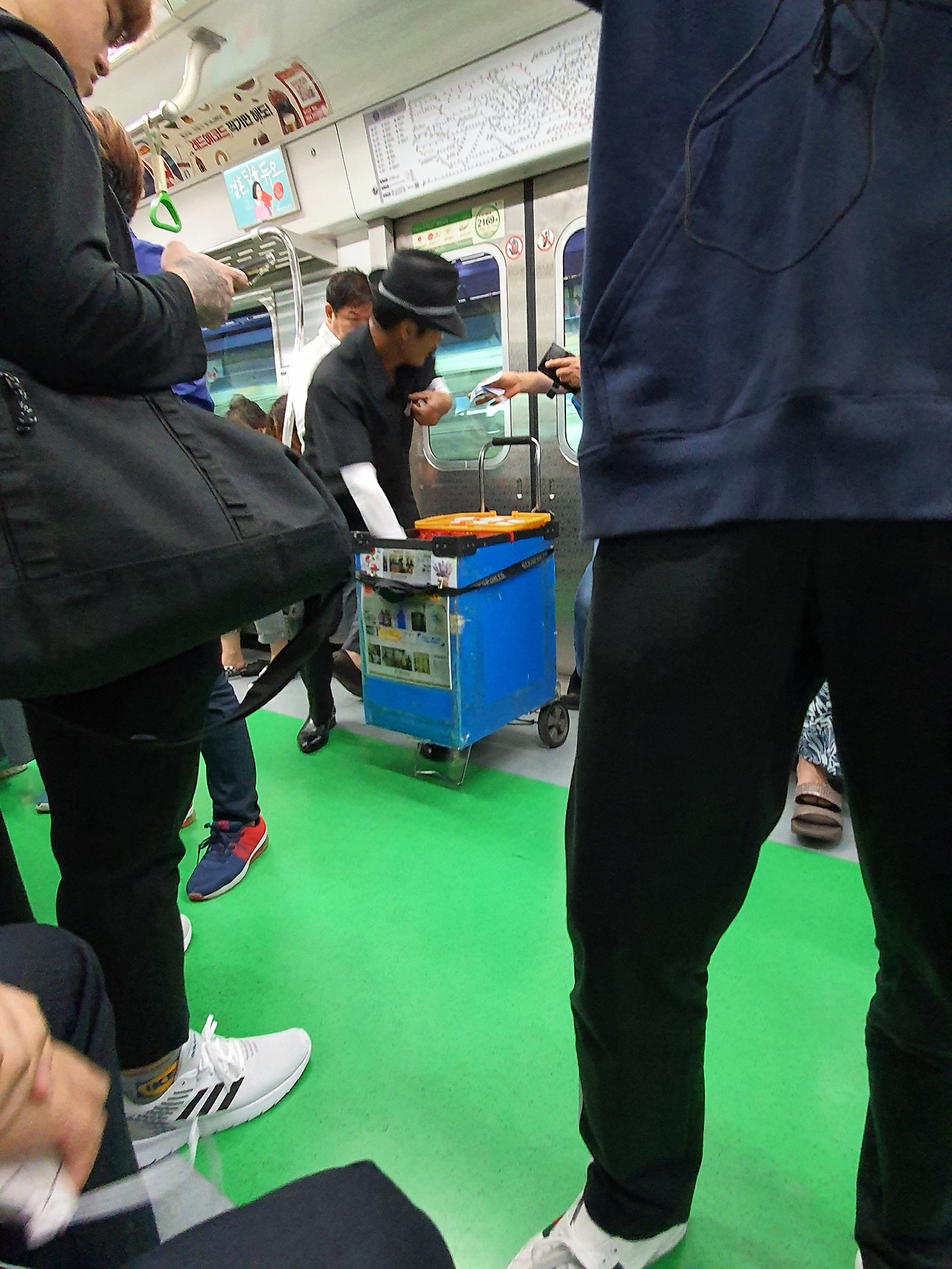 여유 있게 아저씨는 임시 점포인 박스에서 판매를 마치고 친절(?) 하게도 승객들 앞으로 돌아다니며 방문판매를 시작하였다. 나는 꼭 사고 싶었다. 그 와중에도 혹시 내 앞에 안 오면 어쩌나를 걱정하고 있었다. 나의 이러한 소심함에는 나름 이유가 있었다. 나는 천 원짜리 두 장이 눈에 띄도록 약간 오른손을 들었고 매의 눈을 가진 아저씨가 그 순간을 포착하는 것은 당연하였다. 운(?) 좋게도 나는 꼭 필요했던 2천 원짜리 물건을 사서 얼른 가방에 집어넣었다. 그리고 주위를 살짝 한번 둘러보았다. 경범죄를 지은 건 아저씨뿐만이 아니었다. 나를 포함해 그 2천 원짜리 문어발을 산 모든 시민들이었다. 어느새 아저씨는 판매를 마치고 다른 칸으로 이동하고 있었다. 그 자리에서만 몇십 개를 판매하였다. 혹시 TV 프로그램 중에 장사의 신이란 프로그램이 있다면 추천하고 싶다는 생각이 들 정도였다.