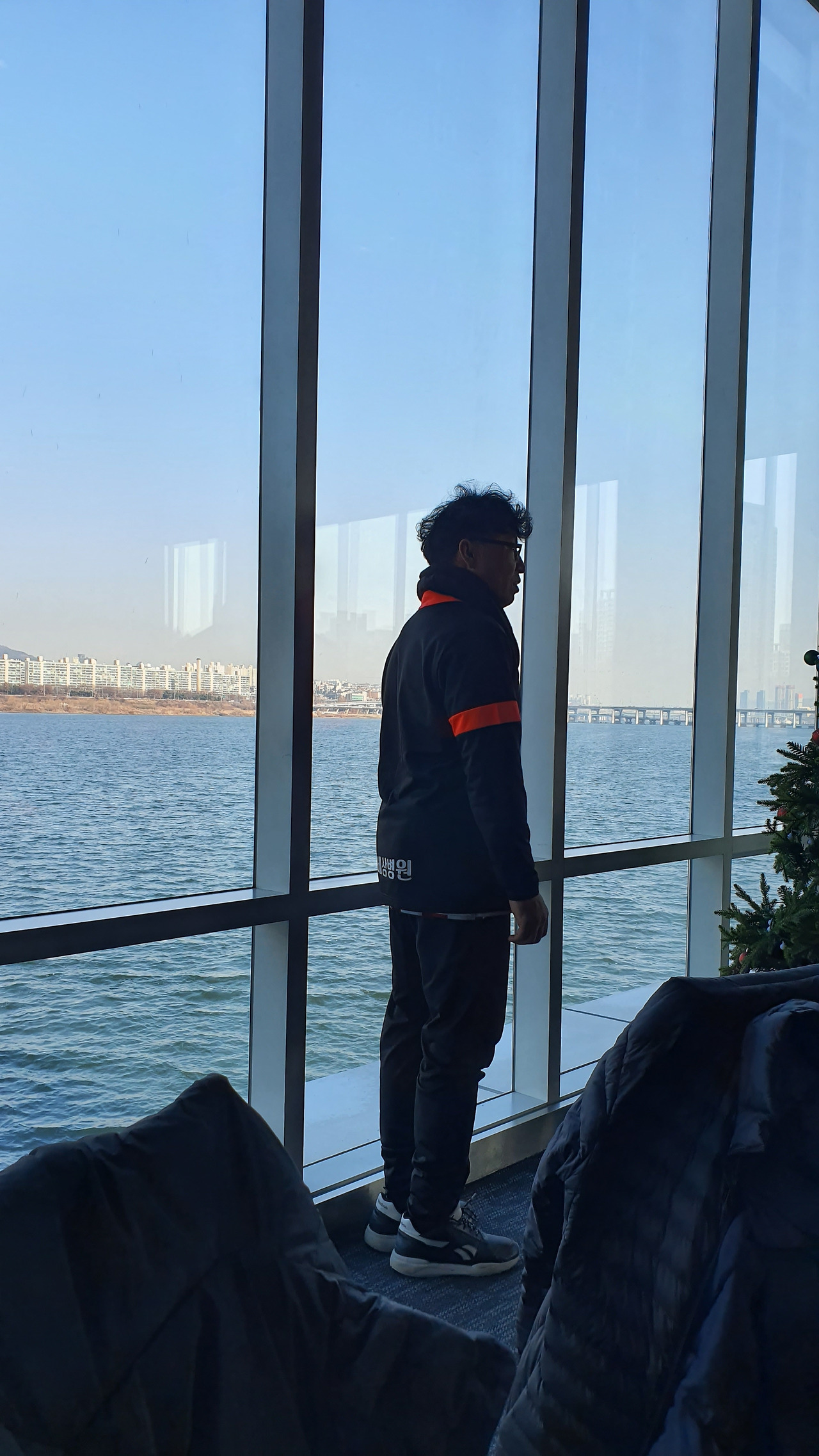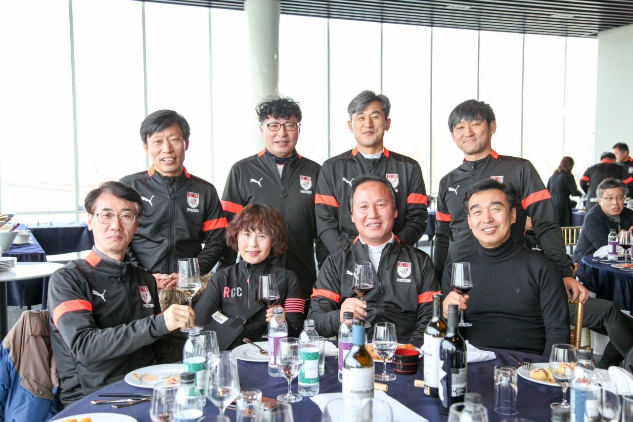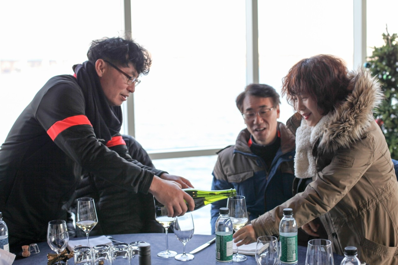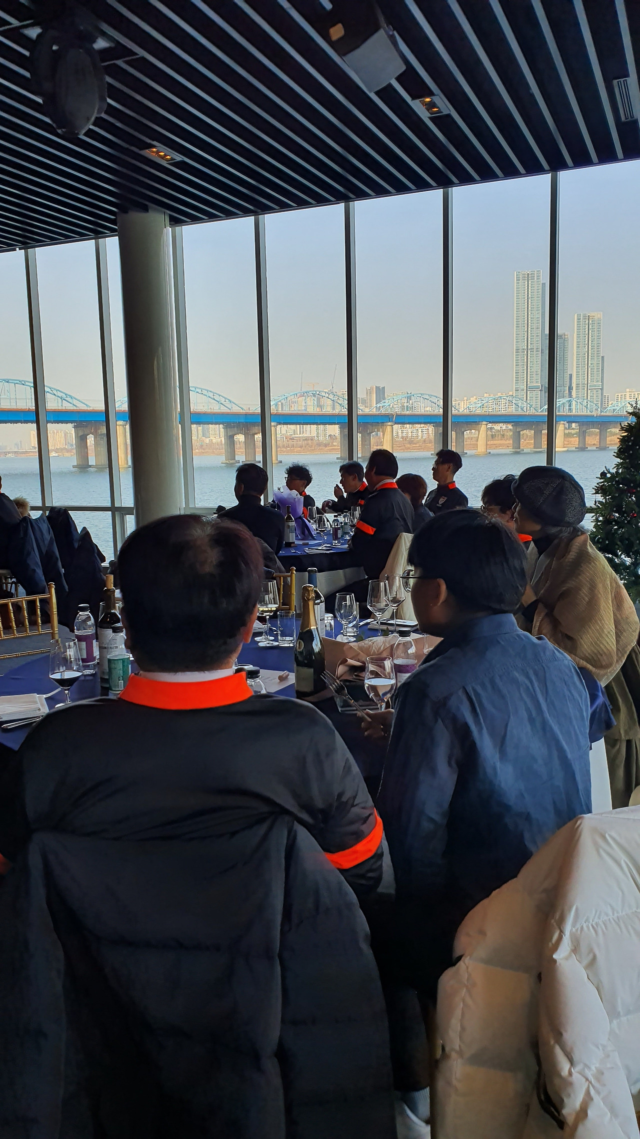 하남 종합운동장에서 오랜만에 선배들과 인사를 나누고 송년회 장소로 향하였다. 송년회는 말로만 듣던 "더 리버"라는 선상 레스토랑이었다. 사실 더 리버는 존재를 알지 못하였다. 많은 선배들이 내비게이션을 켜고도 반포 한강공원에서 몇 바퀴를 돌다가 찾아오는 생경한 곳이었다. 심지어 축사하러 온 의원님도 리버사이드 호텔로 갔다가 왔다고 한다. 이곳에 와본 회원은 서너 명 정도였다. 1층 카페나 2층 레스토랑은 그다지 비싼 편은 아니다. 하지만 3층 프라이빗 룸들은 멤버들만 사용 가능하다. 그곳을 이용해본 회원은 아직 한 명도 없었다. 그곳의 존재만을 들어서 알고 있다고 한다. 한강의 선상에 위치한 더 리버는 놀라운 풍경이었다. 한강에도 이런 럭셔리한 카페와 레스토랑이 있다는 것이 믿기지 않았다. 우리는 2층 레스토랑을 통째로 빌렸다. 식사는 미리 뷔페식으로 70인분을 주문을 했다고 한다. 조기 축구회 송년회를 이런 곳에서도 할 수 있다니 파격이었다. 김치찌개나 삼겹살만 먹던 회식에서 갑자기 상류충(?)이 된 기분이었다. 아무리 태연하고 당당한 척 해려 노력해도 상류층 행세는 어려웠다. 선배들도 서로 얼굴을 보며 어색함을 와인으로 달래고 있었다. 반포 광주식당의 김치찌개와 제육볶음일 줄 알았던 송년회였다. 가랑비에 뭐가 젖고 낮술엔 누구도 알아보지 못한다는 말이 맞았다. 평소에 소맥이나 막걸리파들이 달달하거나 시큼한 와인을 생맥 주마시듯 한다. 결과는 여기저기서 혀 꼬부라지는 소리가 들린다. 막내들은 귀빈 손님은 물론 이 선배들까지 챙겨야 한다.