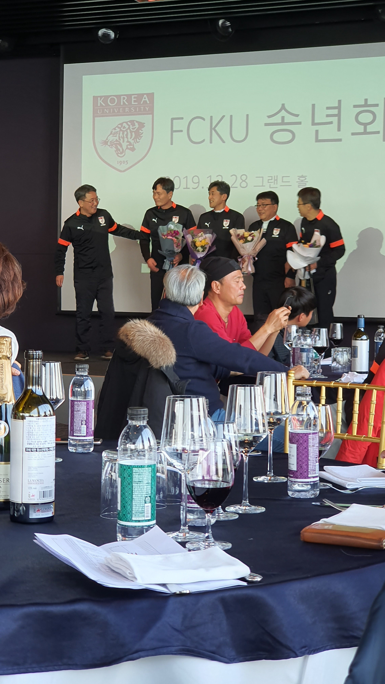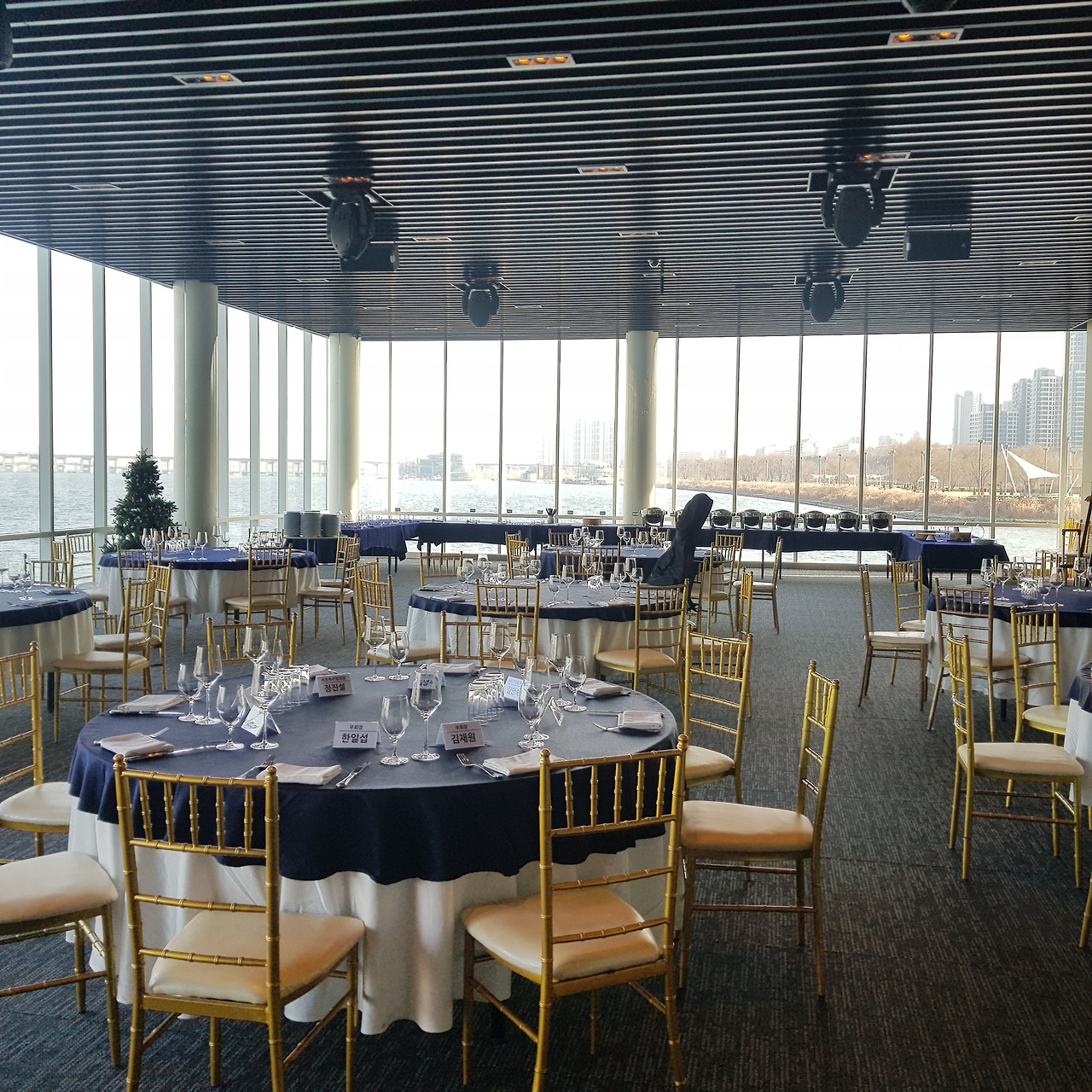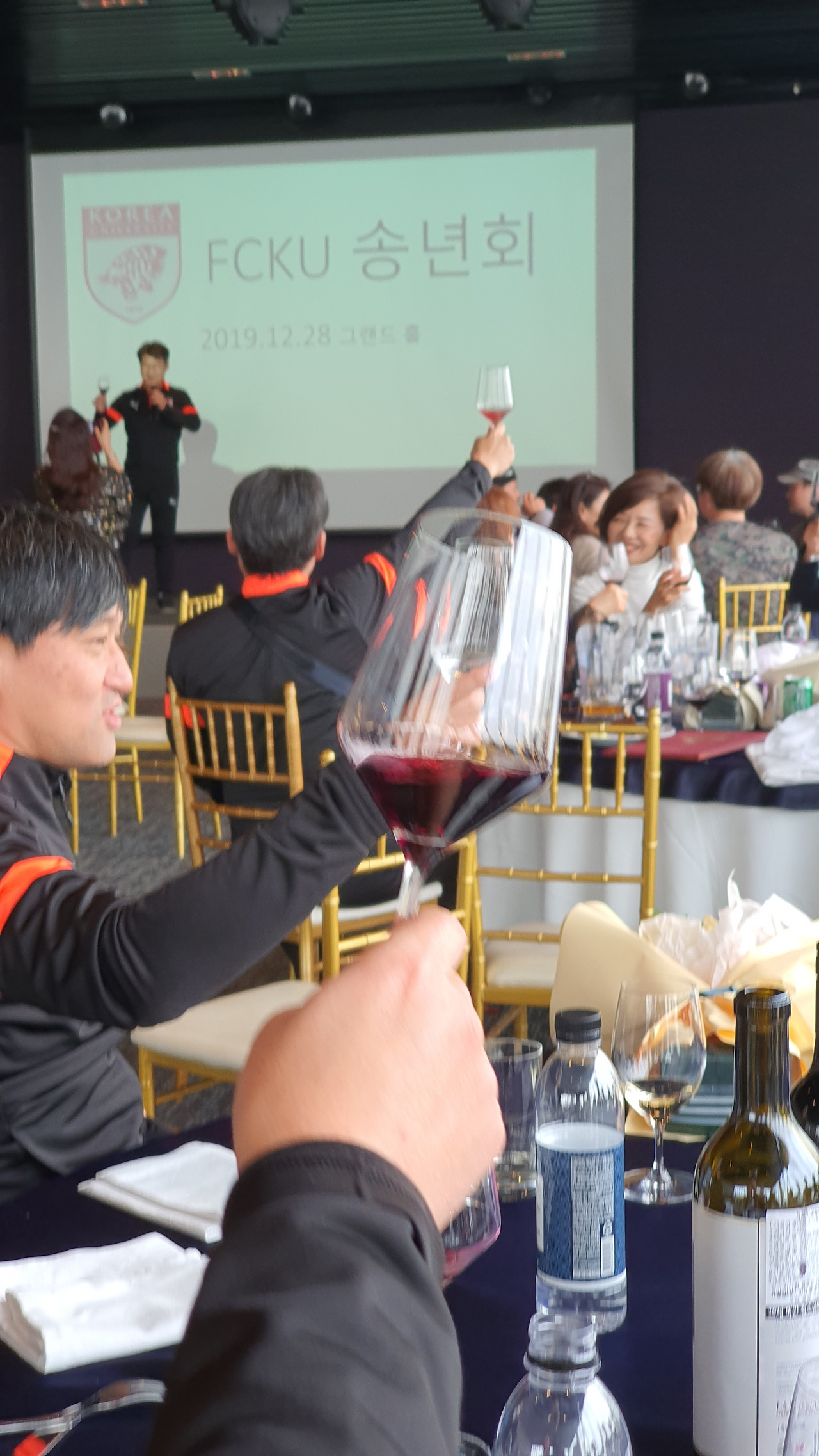 하남 종합운동장에서 오랜만에 선배들과 인사를 나누고 송년회 장소로 향하였다. 송년회는 말로만 듣던 "더 리버"라는 선상 레스토랑이었다. 사실 더 리버는 존재를 알지 못하였다. 많은 선배들이 내비게이션을 켜고도 반포 한강공원에서 몇 바퀴를 돌다가 찾아오는 생경한 곳이었다. 심지어 축사하러 온 의원님도 리버사이드 호텔로 갔다가 왔다고 한다. 이곳에 와본 회원은 서너 명 정도였다. 1층 카페나 2층 레스토랑은 그다지 비싼 편은 아니다. 하지만 3층 프라이빗 룸들은 멤버들만 사용 가능하다. 그곳을 이용해본 회원은 아직 한 명도 없었다. 그곳의 존재만을 들어서 알고 있다고 한다. 한강의 선상에 위치한 더 리버는 놀라운 풍경이었다. 한강에도 이런 럭셔리한 카페와 레스토랑이 있다는 것이 믿기지 않았다. 우리는 2층 레스토랑을 통째로 빌렸다. 식사는 미리 뷔페식으로 70인분을 주문을 했다고 한다. 조기 축구회 송년회를 이런 곳에서도 할 수 있다니 파격이었다. 김치찌개나 삼겹살만 먹던 회식에서 갑자기 상류충(?)이 된 기분이었다. 아무리 태연하고 당당한 척 해려 노력해도 상류층 행세는 어려웠다. 선배들도 서로 얼굴을 보며 어색함을 와인으로 달래고 있었다. 반포 광주식당의 김치찌개와 제육볶음일 줄 알았던 송년회였다. 가랑비에 뭐가 젖고 낮술엔 누구도 알아보지 못한다는 말이 맞았다. 평소에 소맥이나 막걸리파들이 달달하거나 시큼한 와인을 생맥 주마시듯 한다. 결과는 여기저기서 혀 꼬부라지는 소리가 들린다. 막내들은 귀빈 손님은 물론 이 선배들까지 챙겨야 한다.
