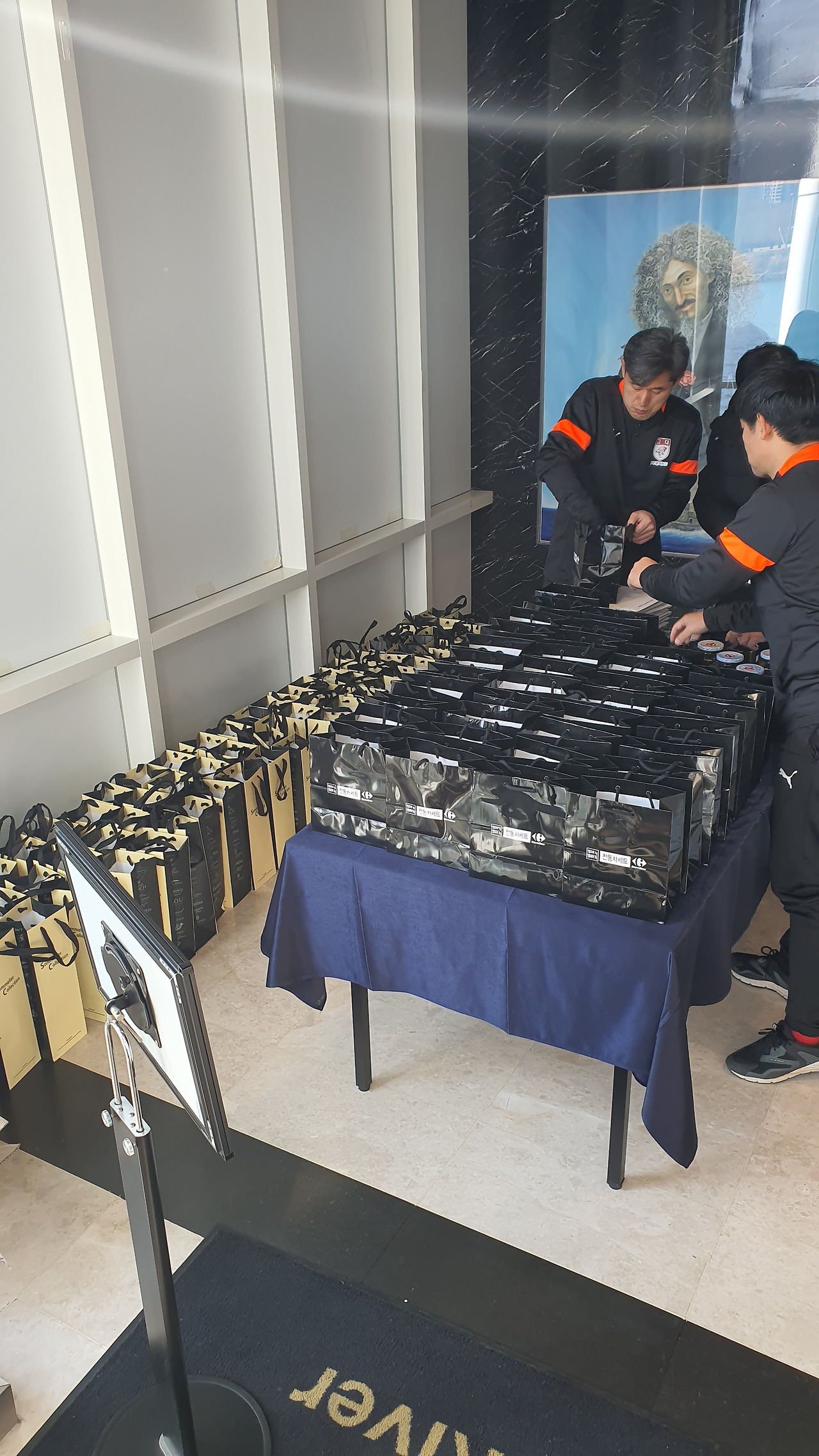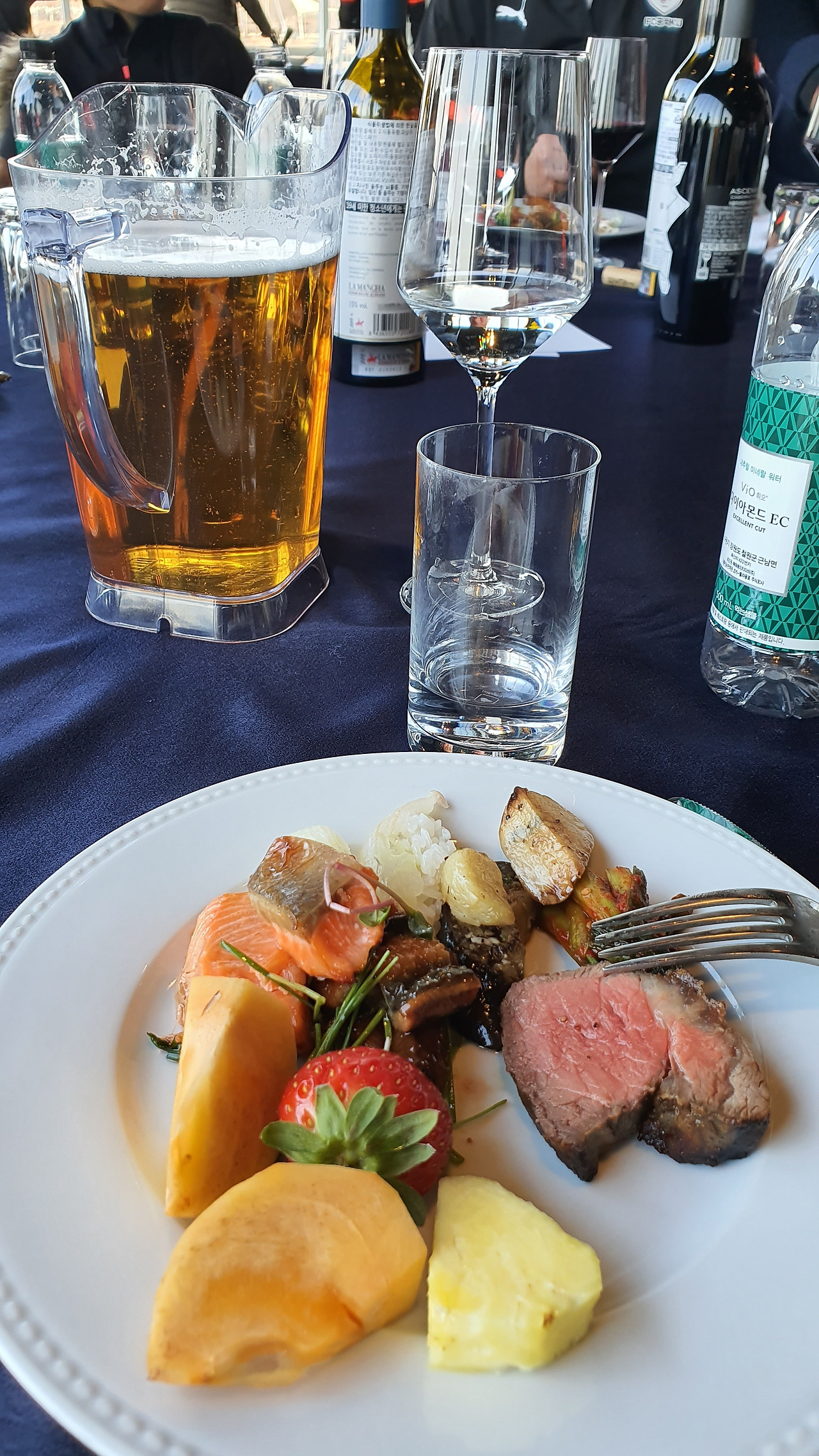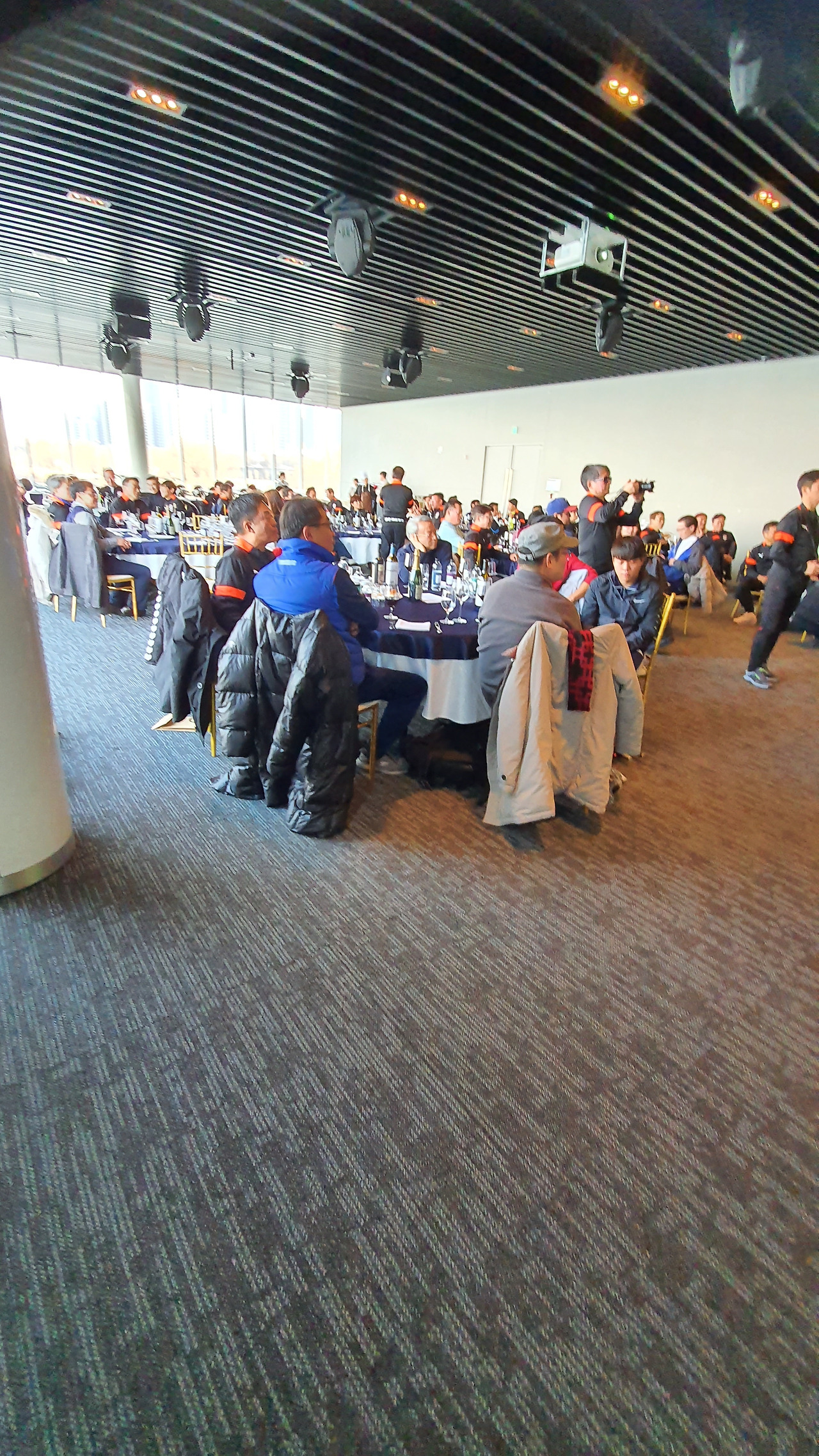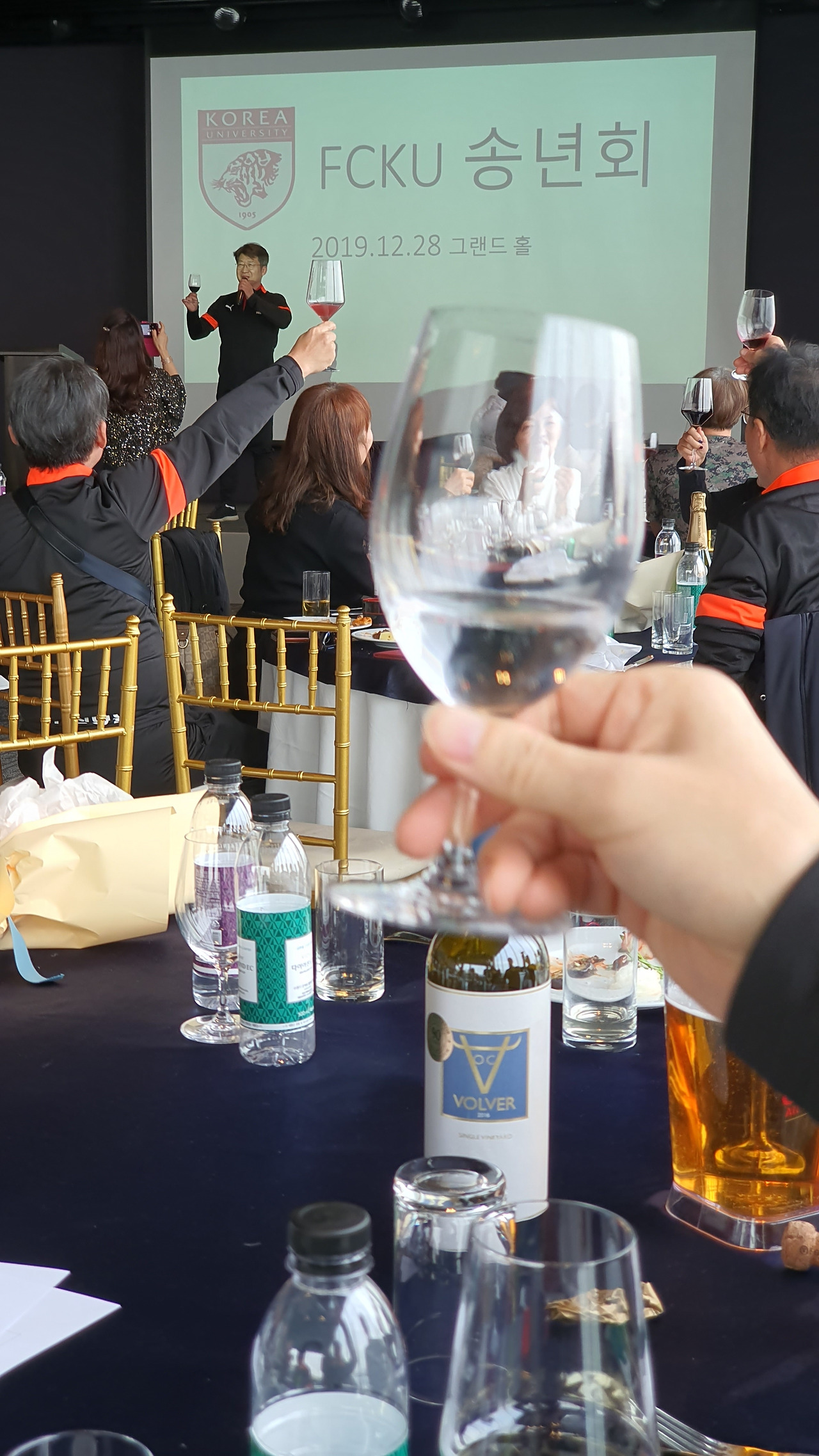 하남 종합운동장에서 오랜만에 선배들과 인사를 나누고 송년회 장소로 향하였다. 송년회는 말로만 듣던 "더 리버"라는 선상 레스토랑이었다. 사실 더 리버는 존재를 알지 못하였다. 많은 선배들이 내비게이션을 켜고도 반포 한강공원에서 몇 바퀴를 돌다가 찾아오는 생경한 곳이었다. 심지어 축사하러 온 의원님도 리버사이드 호텔로 갔다가 왔다고 한다. 이곳에 와본 회원은 서너 명 정도였다. 1층 카페나 2층 레스토랑은 그다지 비싼 편은 아니다. 하지만 3층 프라이빗 룸들은 멤버들만 사용 가능하다. 그곳을 이용해본 회원은 아직 한 명도 없었다. 그곳의 존재만을 들어서 알고 있다고 한다. 한강의 선상에 위치한 더 리버는 놀라운 풍경이었다. 한강에도 이런 럭셔리한 카페와 레스토랑이 있다는 것이 믿기지 않았다. 우리는 2층 레스토랑을 통째로 빌렸다. 식사는 미리 뷔페식으로 70인분을 주문을 했다고 한다. 조기 축구회 송년회를 이런 곳에서도 할 수 있다니 파격이었다. 김치찌개나 삼겹살만 먹던 회식에서 갑자기 상류충(?)이 된 기분이었다. 아무리 태연하고 당당한 척 해려 노력해도 상류층 행세는 어려웠다. 선배들도 서로 얼굴을 보며 어색함을 와인으로 달래고 있었다. 반포 광주식당의 김치찌개와 제육볶음일 줄 알았던 송년회였다. 가랑비에 뭐가 젖고 낮술엔 누구도 알아보지 못한다는 말이 맞았다. 평소에 소맥이나 막걸리파들이 달달하거나 시큼한 와인을 생맥 주마시듯 한다. 결과는 여기저기서 혀 꼬부라지는 소리가 들린다. 막내들은 귀빈 손님은 물론 이 선배들까지 챙겨야 한다.