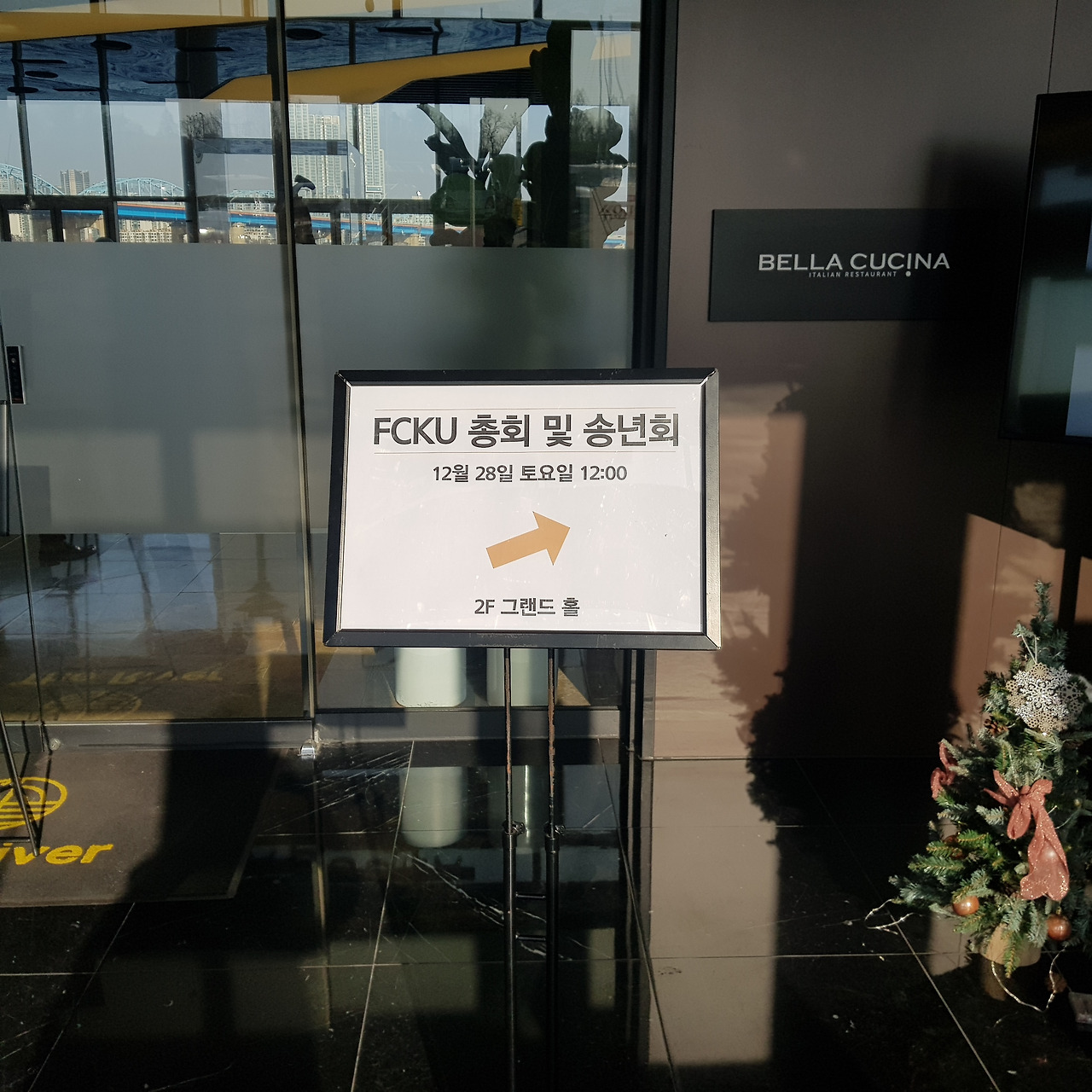 12월 28일 토요일 아침이었다. 7시에 눈을 뜨긴 했는데... 추운 날씨 탓에 선뜻 축구장에 나가기가 망설여진다. 이불 밖으로 나가면 왠지 얼어 죽을 것 같은 영하 6도의 아침 날씨였다. 그래도 올해 마지막 토요일은 조기축구 송년회가 있는 날이다. 경기는 7시부터 10시까지다. 12시부터는 반포에서 송년회가 있다. 아파 운동은 못해도 얼굴도장이라도 찍어야 한다. 얼굴이라도 내밀고 상품권이라도 하나 받아야 한다. 하늘 같은 선배들에게 빠따(?)를 맞지 않으려면....., 선배들은 빠따(?)를 잔소리가 아닌 굵은 소리로 한 번씩 던진다. 그 빠따(?)에 찔리면 온몸이 아프다! 9시 반쯤 겨우 하남 경기장에 도착해보니 거의 마무리 단계다. 일단 출석 체크는 한셈이다. 10시가 되자 정확하게 경기가 끝났다. 모두 반가운 얼굴들이다. 대부분이 하늘 같은 선배님들이다. 동기와 후배는 겨우 서너 명도 안된다. 일단 학번도 학번이지만 쪽수에서 너무 밀린다. 무조건 복종이다. 강아지나 고양이처럼 드러누워 배라도 보여줄 태세다. 30분이면 송년 회장까지 갈 수 있는 거리다. 토요일 오전의 시내방향 올림픽 대로는 막히지 않는 편이다. 2시간이나 여유를 둔 이유를 선배님에게 물으니 한강에 가서 씻고 오라는 것이다. 이 추운 겨울에 말이다. 이유는 오늘은 식당이 아니라서 땀 냄새 풍기면 곤란하단다. 다행히 난 경기에 뛰지 않아서 한강물에 손을 담글 일은 없었다.
