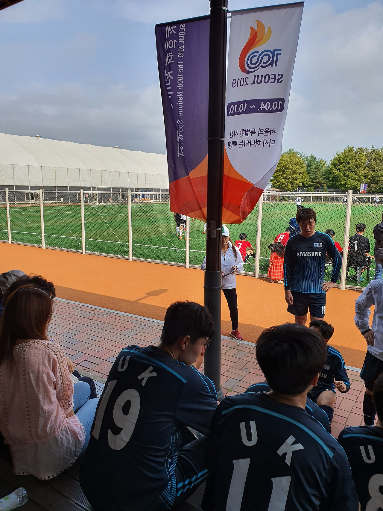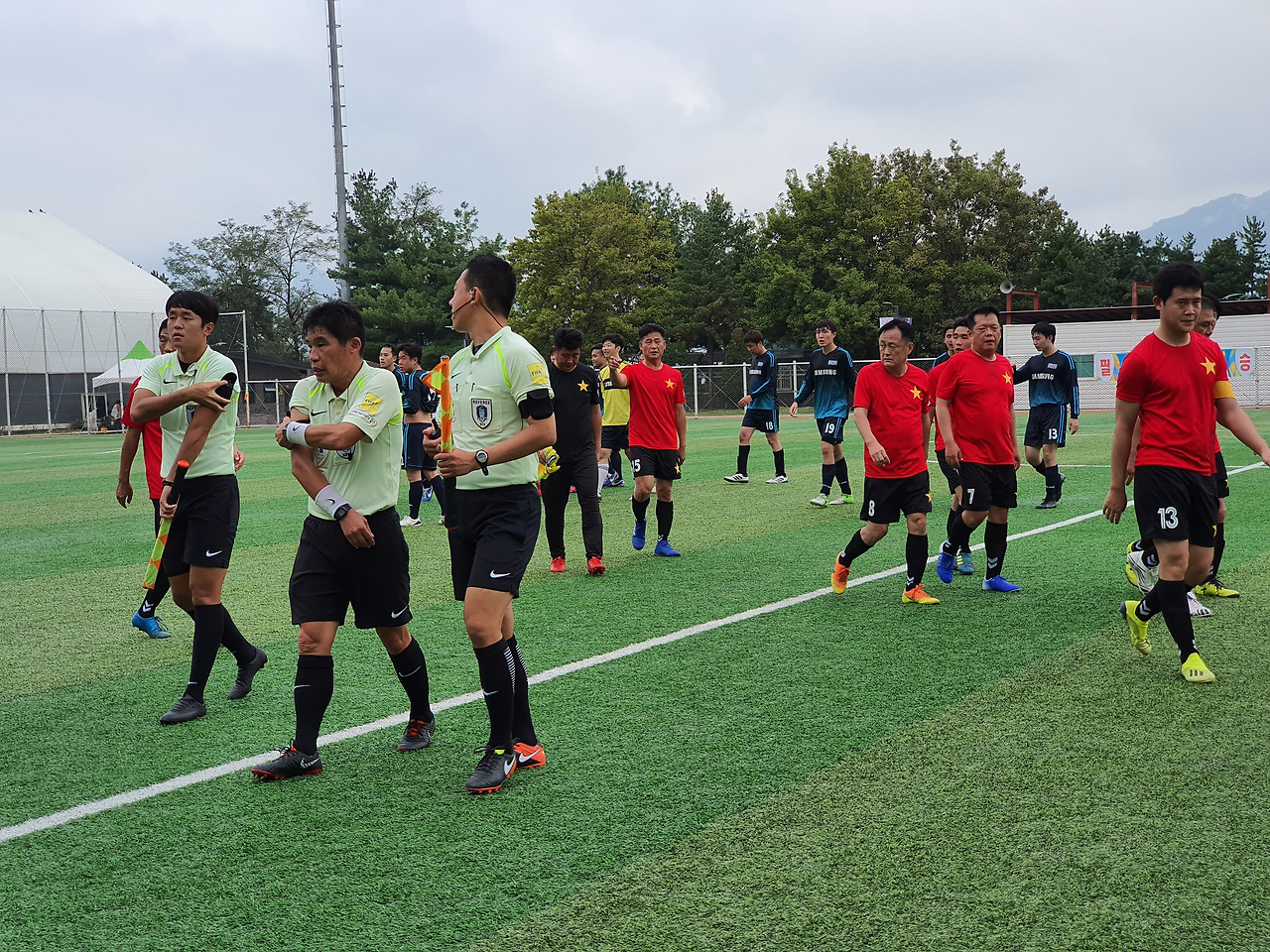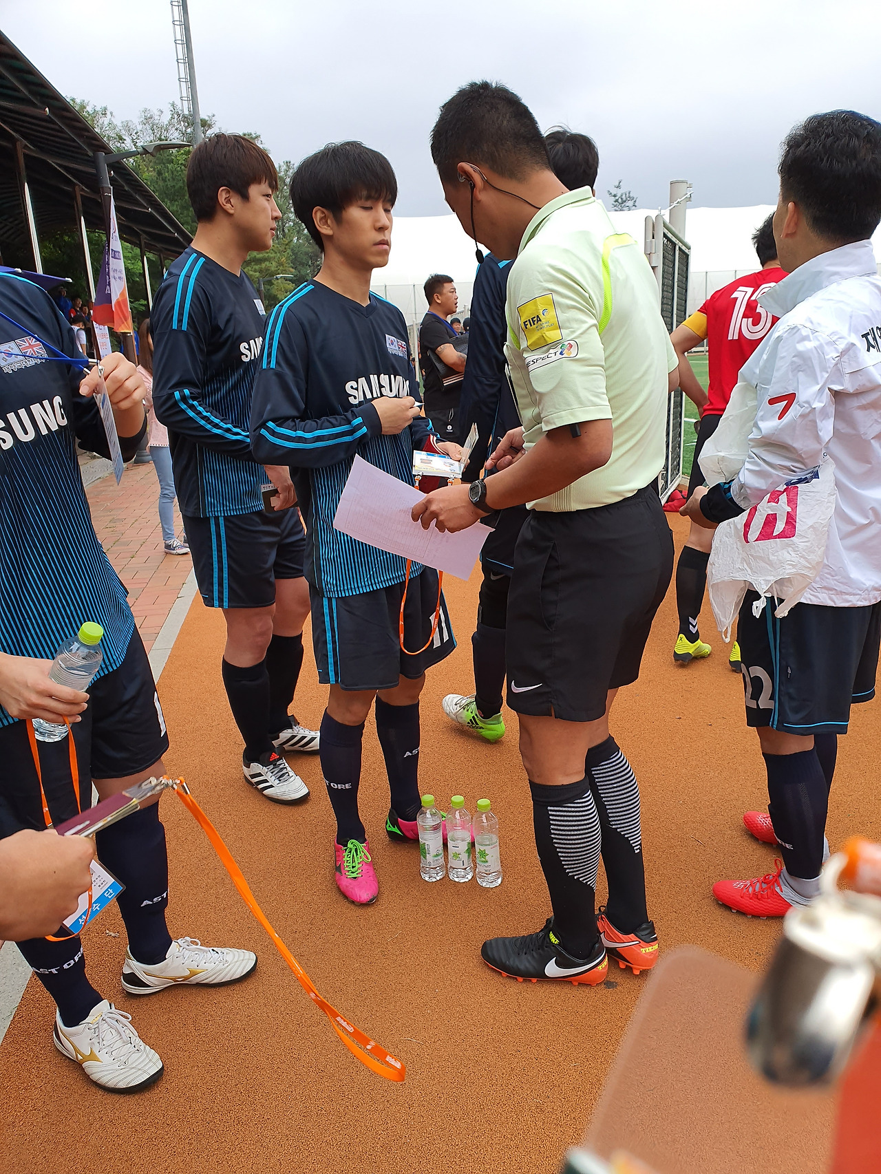 영국팀 감독님 잠깐만요? 감독님은 선수들과 같은 유니폼을 입으시면 안 됩니다. 경기하는 선수들과 혼동이 될 수 있으니 형광조끼나 다른 옷으로 갈아입으셔야 경기장에 입장하실 수 있습니다.