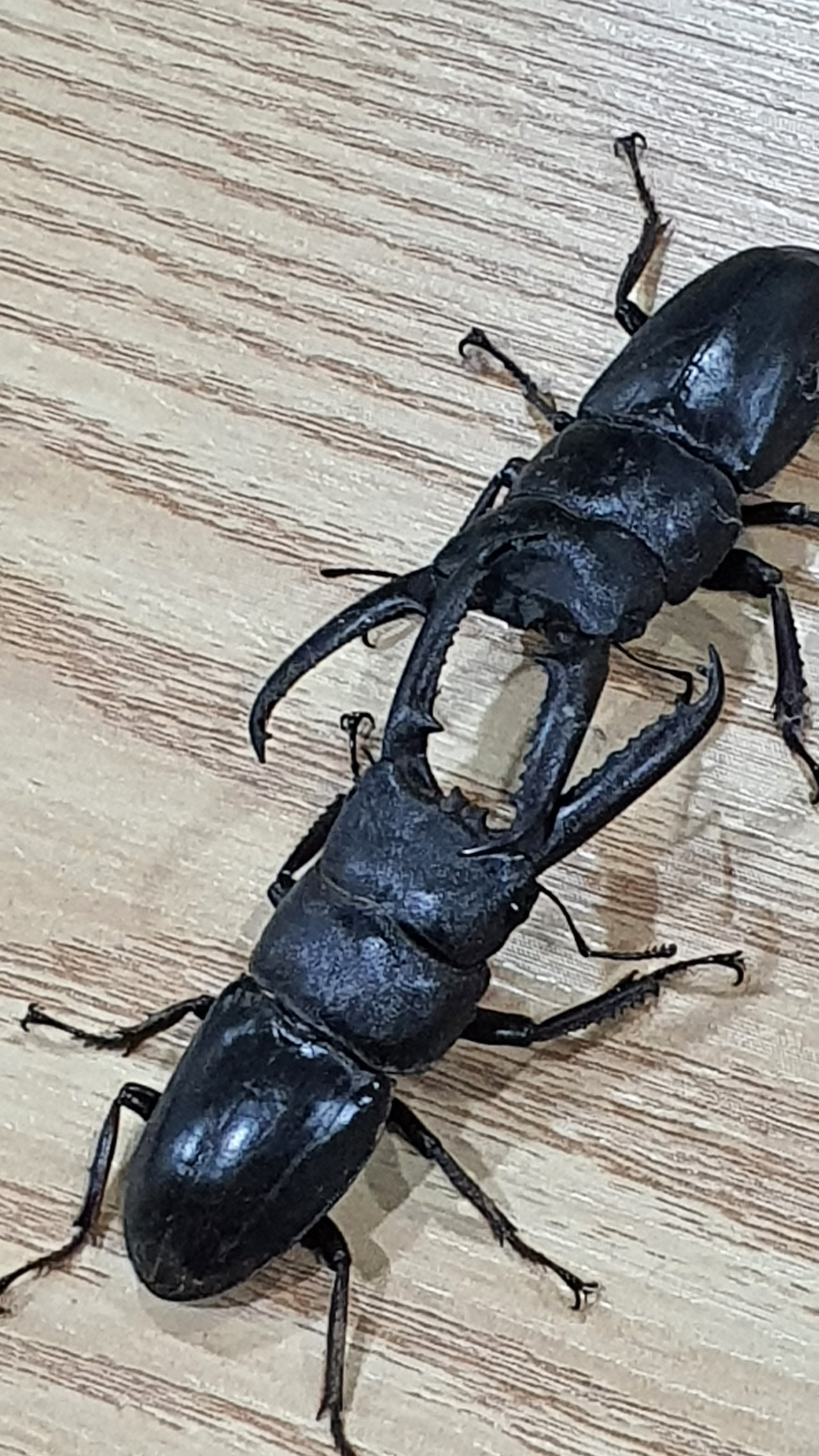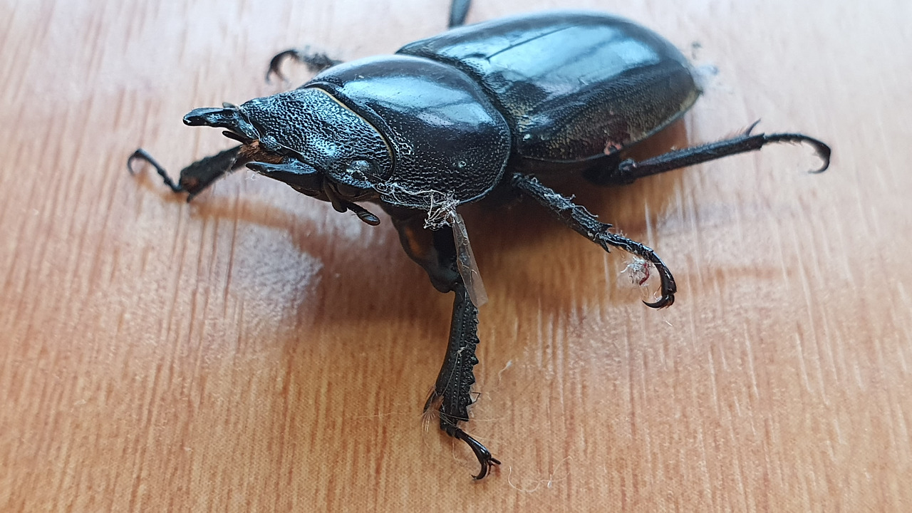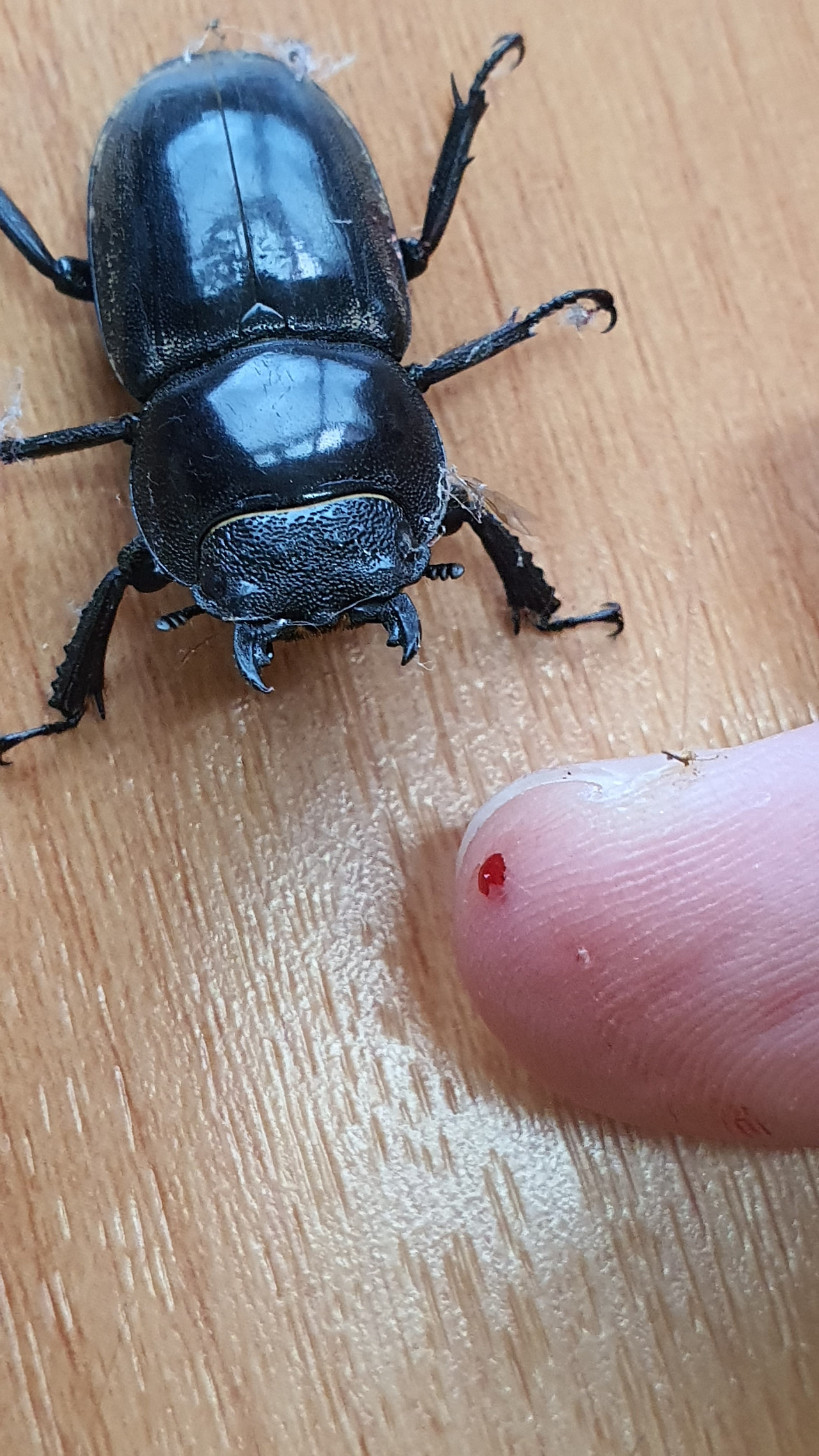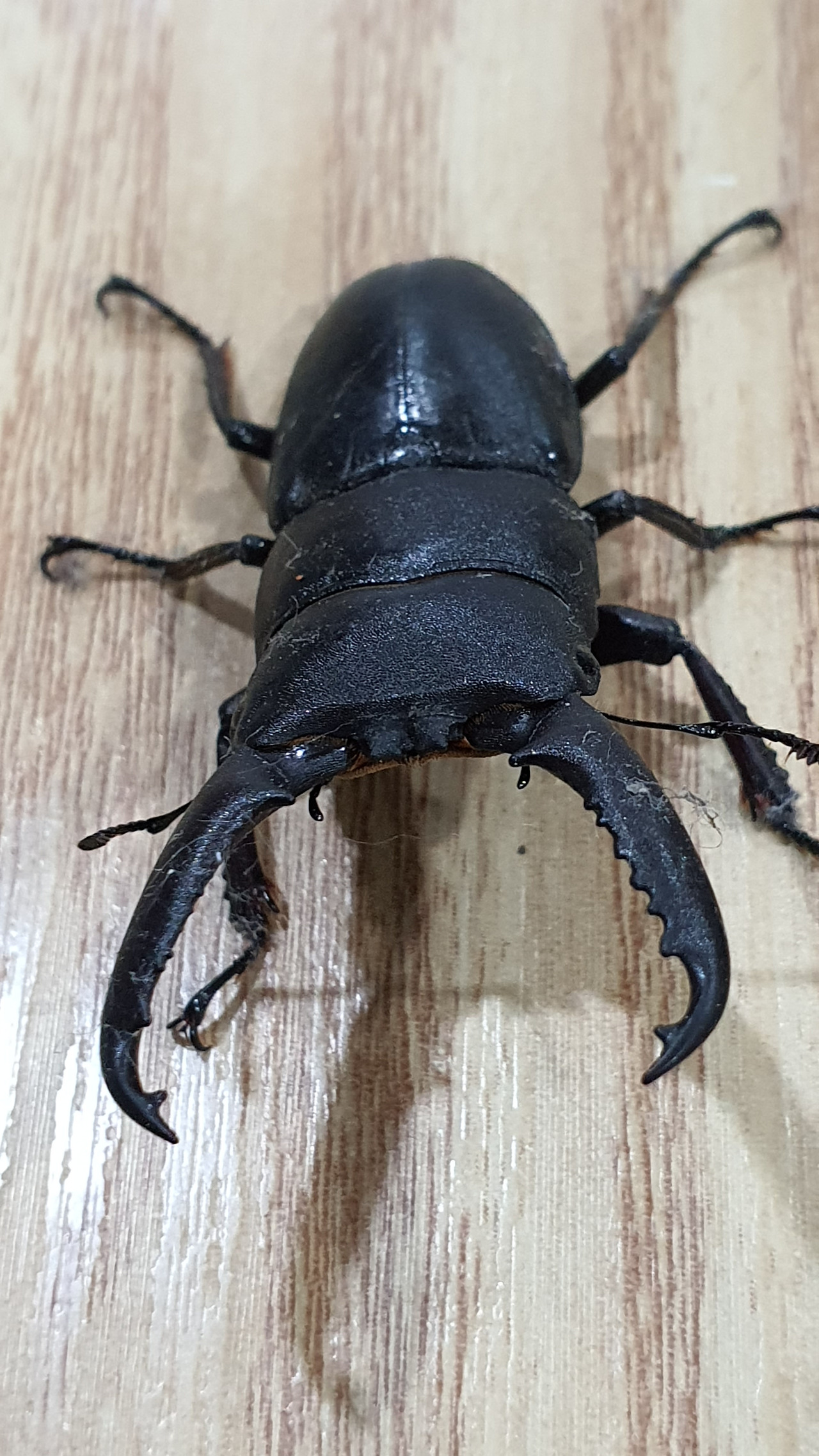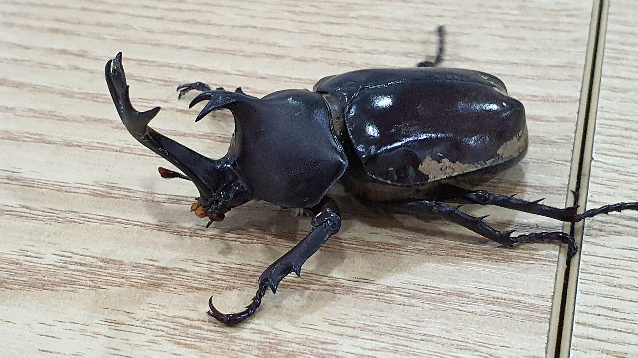 장수풍뎅이 암컷, 수컷에 비해 체구가 작지만 집게에 물리면 피부가 뚤릴 정도로 강력한 집게를 자랑한다.