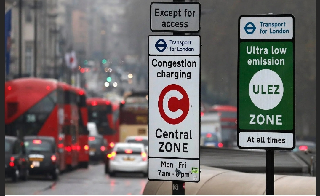 런던의 도심 혼잡 통행료 지역임을 알리는 도료 표지판
