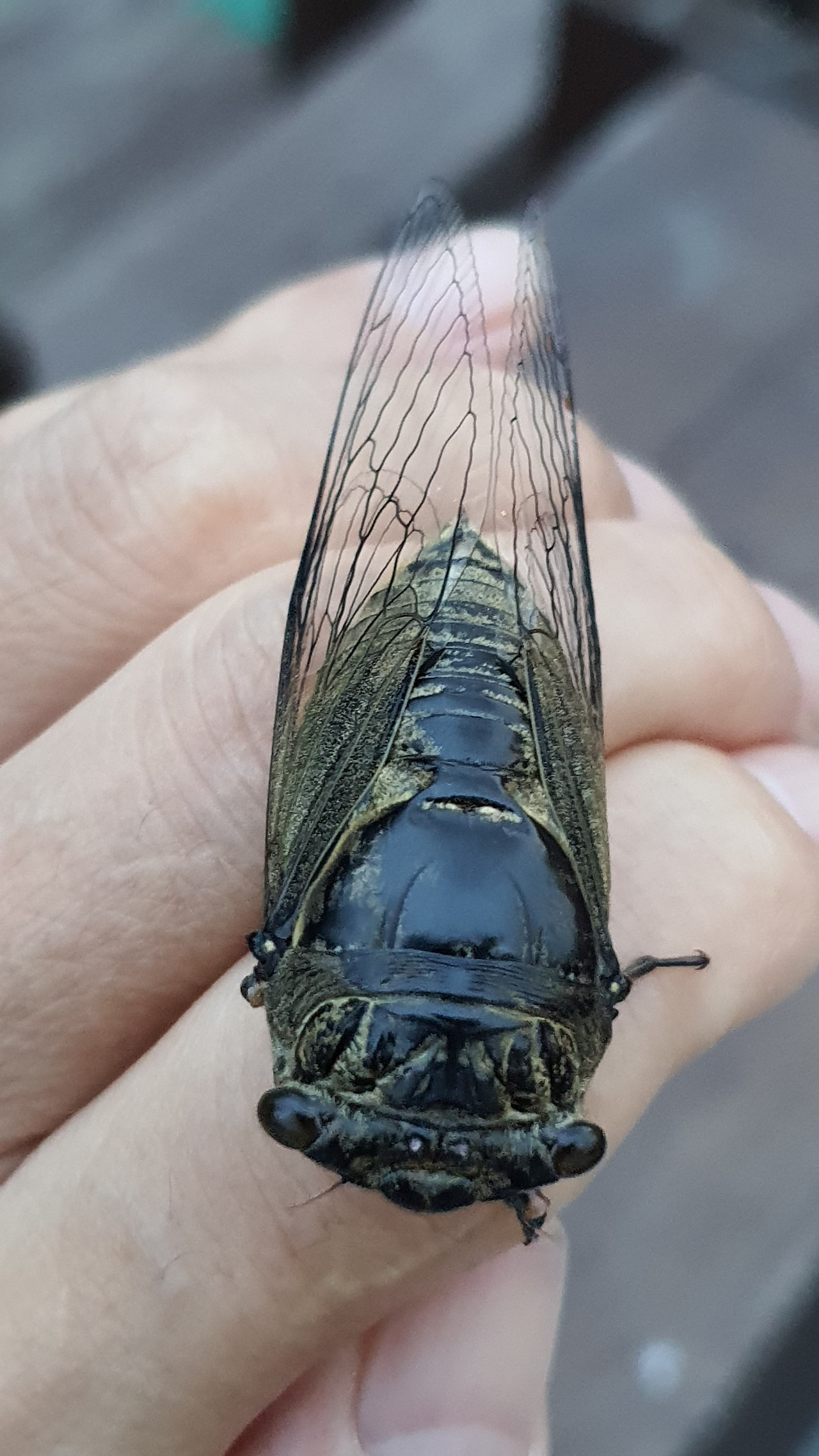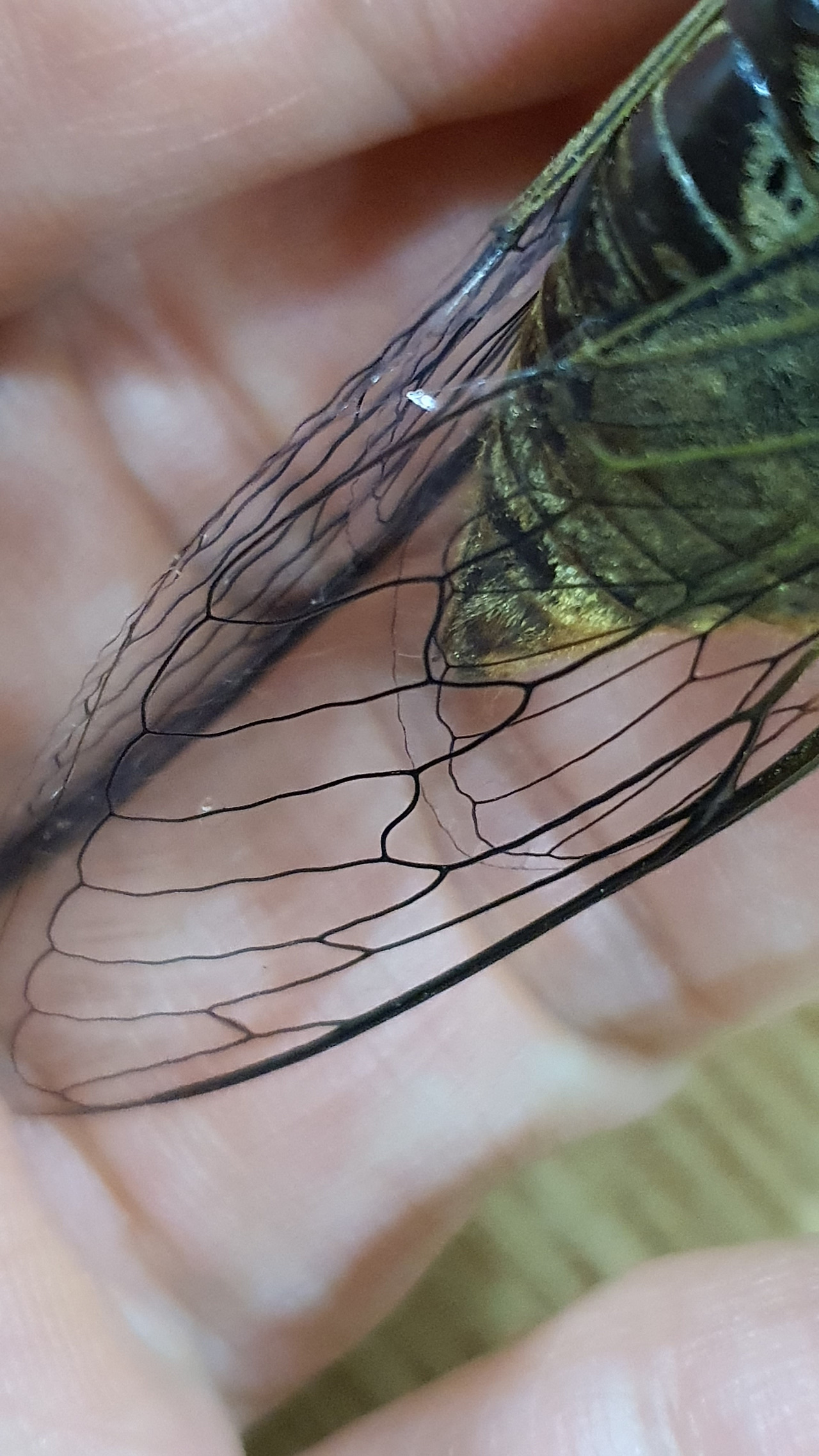매미의 투명한 날개 밑에 꼬리가 보인다.