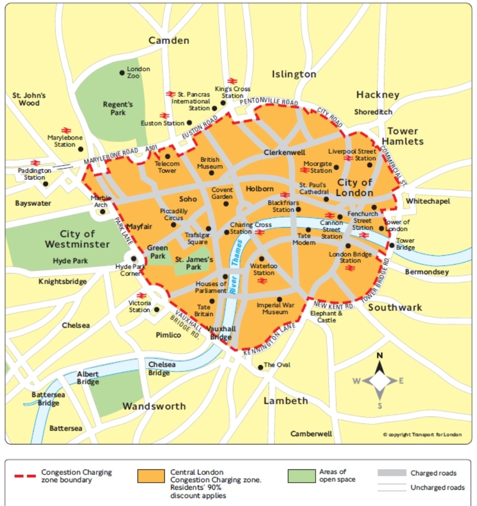 런던의 도심 혼잡 통행료 구간, 대부분의 Zone 1이 다 포함된다.