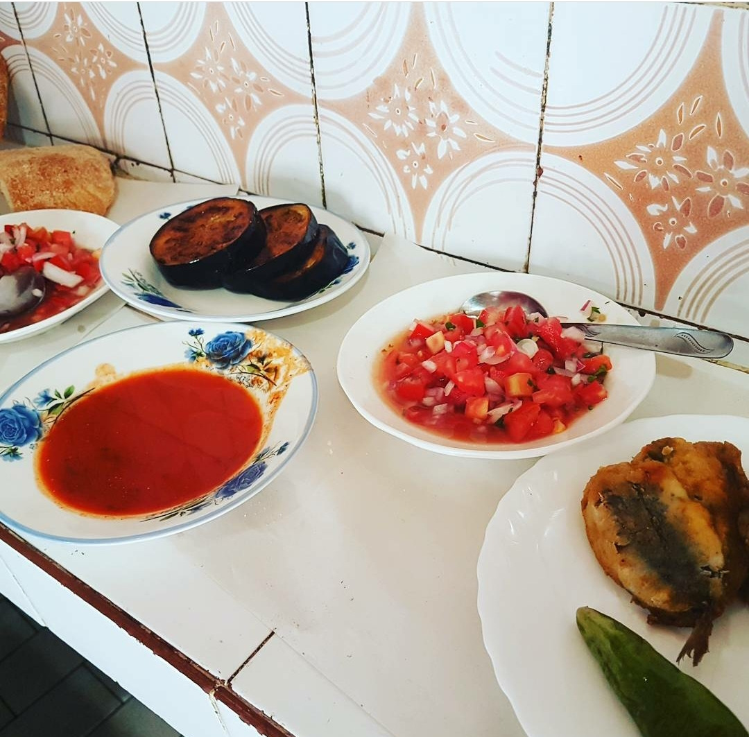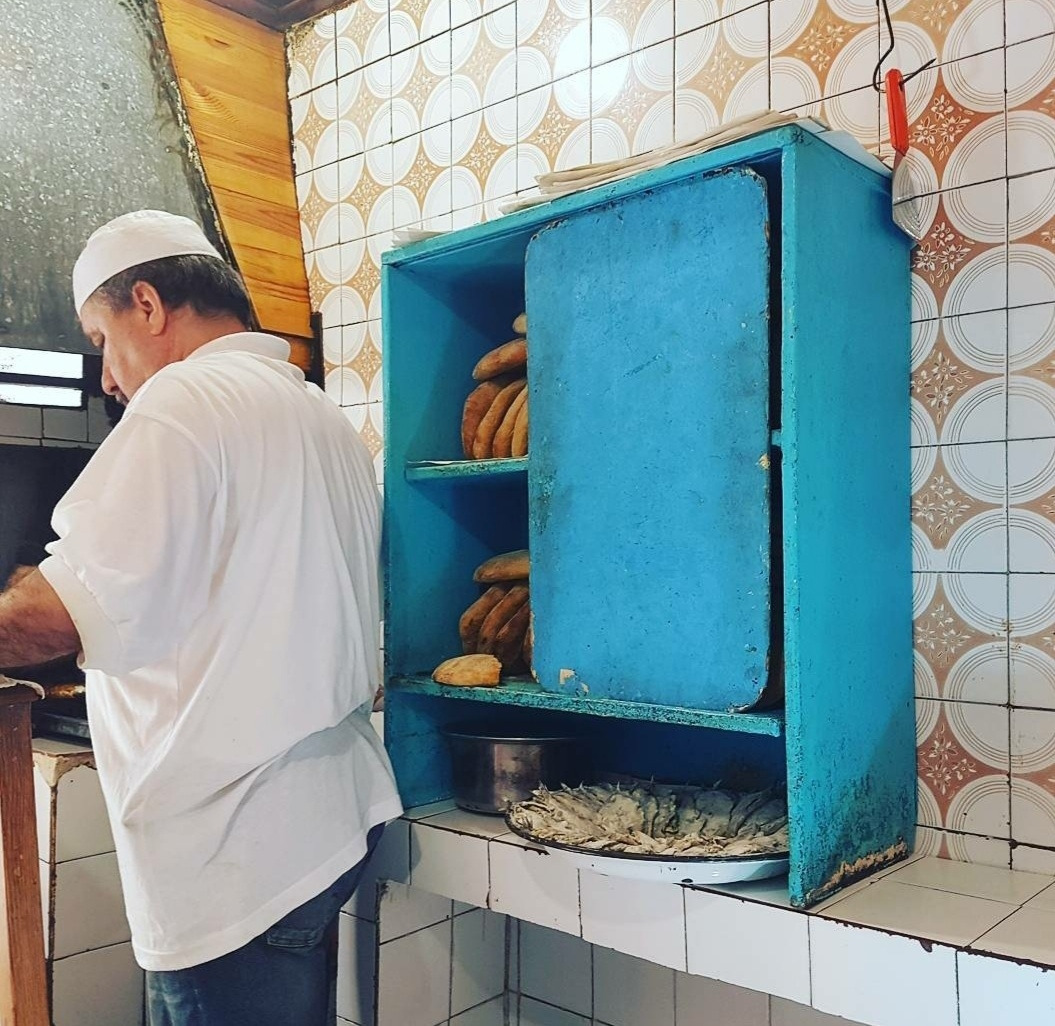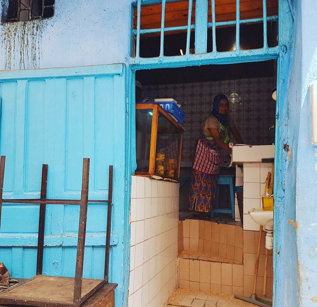 모로코 라밧 메디나의 간판도 메뉴판도 없는 식당의 좌석과 내가 먹은 모로코 음식들. 이 테이블이 식당에 있는 유일한 테이블이다. 2인용인데 네 사람이 오면 두 사람은 서서 먹는다.