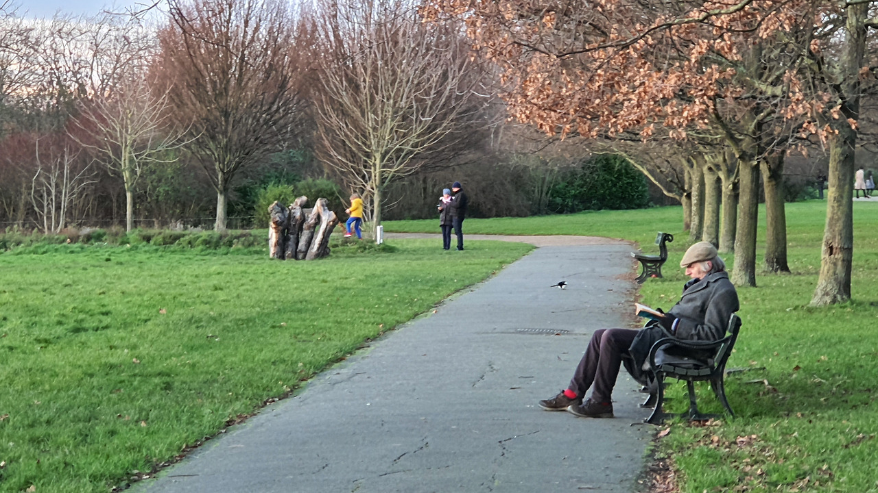 2020년 12월 25일 런던 리젠트 파크에서 만난 책 읽는 할아버지의 모습. 장갑을 끼고도 손이 많이 시린 날이었다.