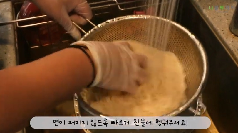 국수를 탱탱하고 쫄깃쫄깃하게 먹기 위해선 찬물에 헹궈주어야 합니다! 벌써 시원해지는 기분이네요~