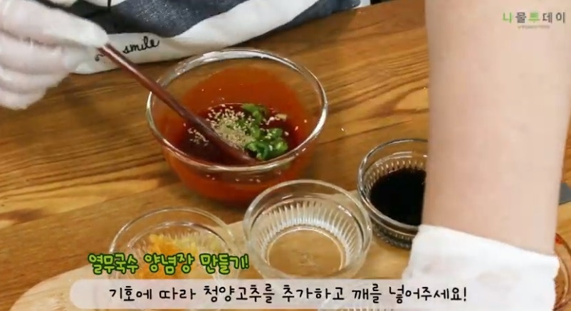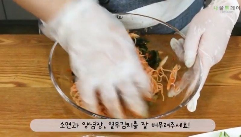 ④ 소면에 열무김치, 양념장을 넣고 버무리기