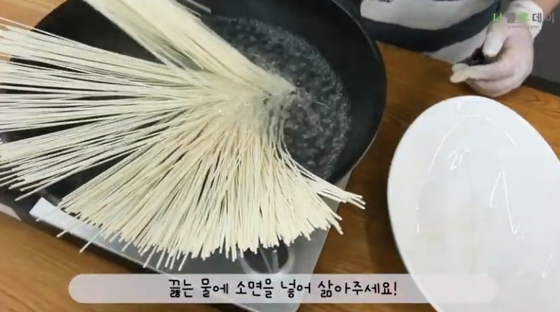 끓는 물에 소면 넣고 삶아줍니다! 영상으로 보시면 소면을 넣고 펴는 모습이 아주 화려? 합니다ㅎㅎ 영상으로도 꼭 확인해주시면 좋겠습니다! (하단에 주소 남겨두었습니다)