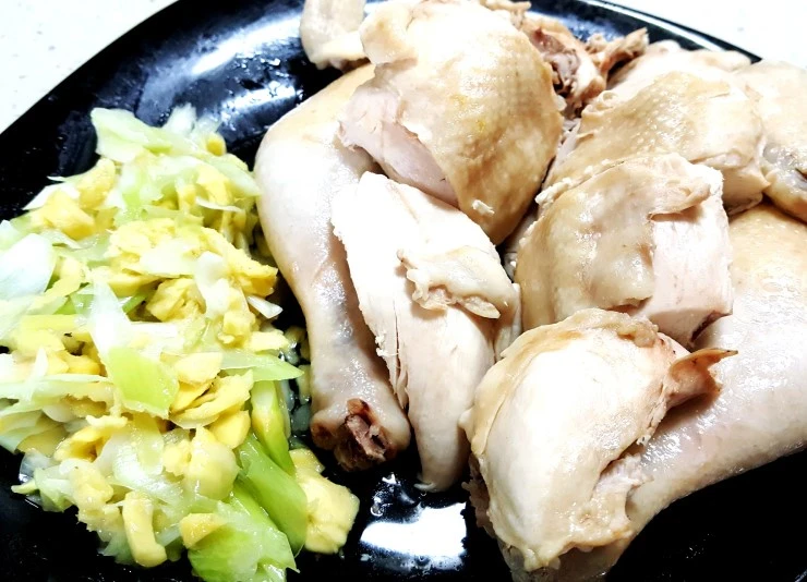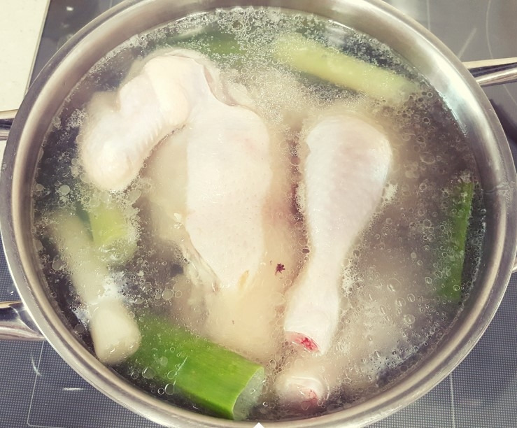 깨끗이 손질한 닭에 식용유를 바르고 끓는 물에 넣어 10분간 팔팔 끓여준다. 이후 불을 끄고 30분간 가만히둔다. 어열로 익히면 닭이 더욱 부드러워진다.