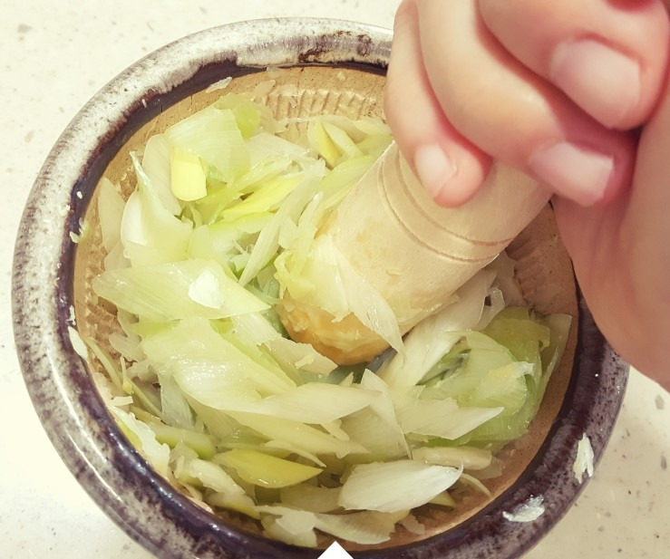 대파 2 뿌리도 흰 부분만 골라 절구에 넣어 짓이기듯 빻아준다.