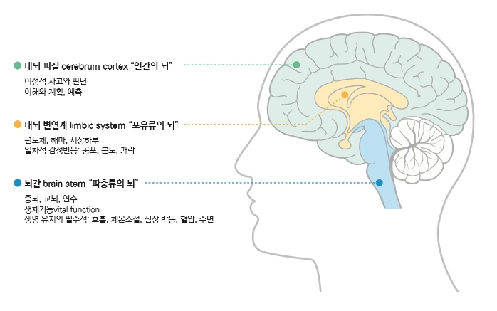 변연계의 ‘amygdala’는 공포 감정을 관장하는데, 자율신경계의 중심에서 각종 자율 기능의 조절 및 통합과 관련한 시상하부와 연결이 되어 있어서, ‘공포감, 불쾌감’이 느껴질 때 심장박동, 혈압 등의 변화를 인식하게 된다.