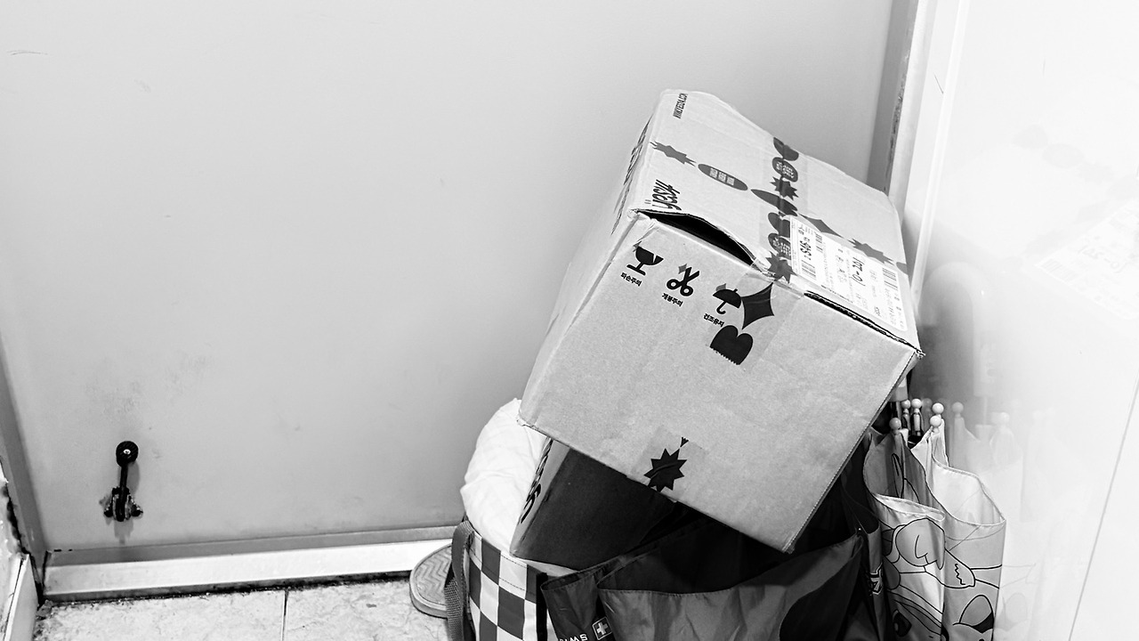 신발장 앞엔 몇 달째 뜯지 않은 박스가 놓여 있다.
