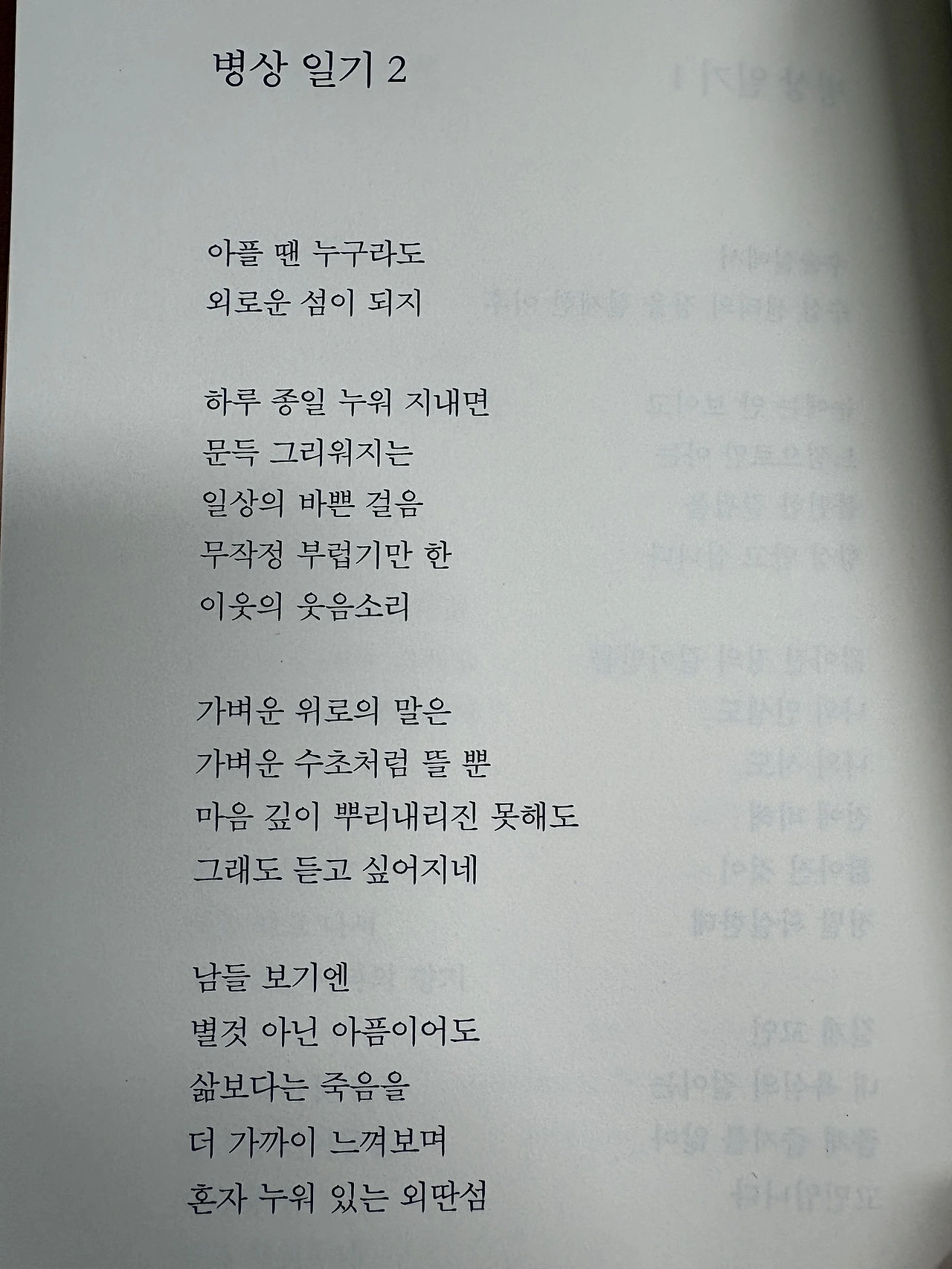 “병원에서 나의 소망은 / 나날이 작아지고 있네 / 그저 숨을 쉬는 것만도 감사하면서 / 겸손해지지 않을 수가 없네” (‘병원에서‘ 중에서…)