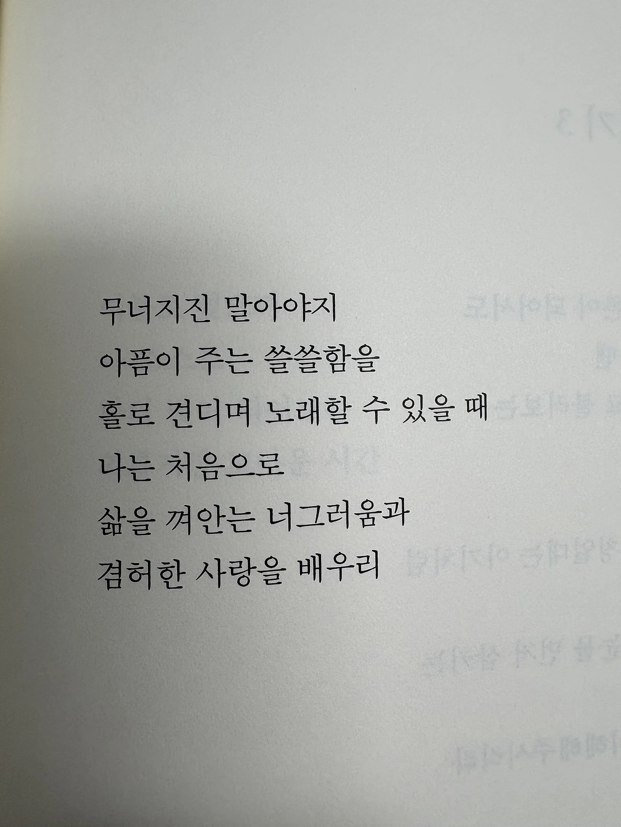 “무너지지 말아야지 / 아픔이 주는 쓸쓸함을 / 홀로 견디며 노래할 수 있을 때 / 나는 처음으로 / 삶을 껴안는 너그러움과 / 겸허한 사랑을 배우리“