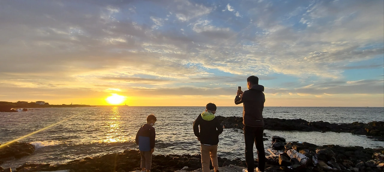 산책하며 만나는 일몰을 놓칠 수 없지. 일몰 구경하는 삼부자들매일 장엄한 경치를 집 문만 열면 보다 보니 웬만한 경치 좋은 곳에 가도 그러려니 하는 거만함이 생겼다. 제주 어디서나 잘 보이는 한라산을 보며 오늘 날씨가 얼마나 쾌청했는지, 시계가 얼마나 좋은지를 가늠해 본다. 이사오기 전 집들에서는 거실 창문 너머로 바다가 보여 매일 창문 커튼을 열며, 수평선이 잘 보이는지 확인하며 날씨를 가늠했다면 이제는 한라산이 잘 보이는지, 안 보이는 지로 날씨를 가늠한다.