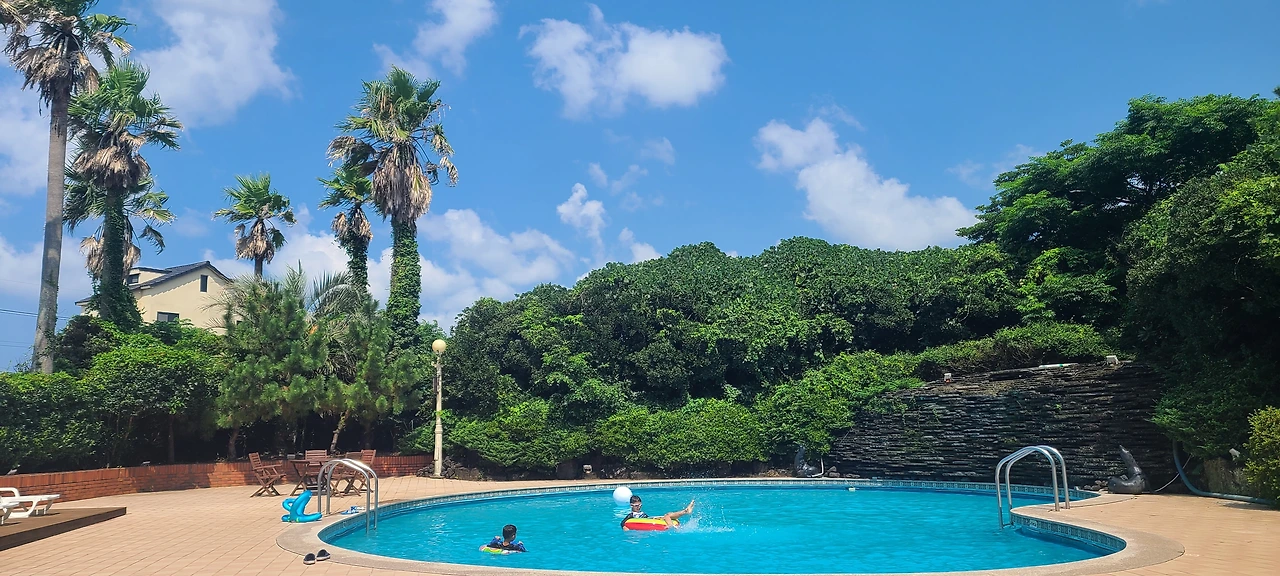 주중에는 나도 일을 하고, 아이들도 학원 가느라 바쁘니 토요일 아점을 먹고 집 근처 수영장으로 달려왔다. 호텔 수영장이지만 비투숙객도 이용 가능한 데다가 도민 할인까지 해주니 이보다 좋을쏘냐. 거기에다 체크인, 아웃 사이 시간에 이용하면 전세 낸 듯이 놀 수 있으니 이 또한 좋다.