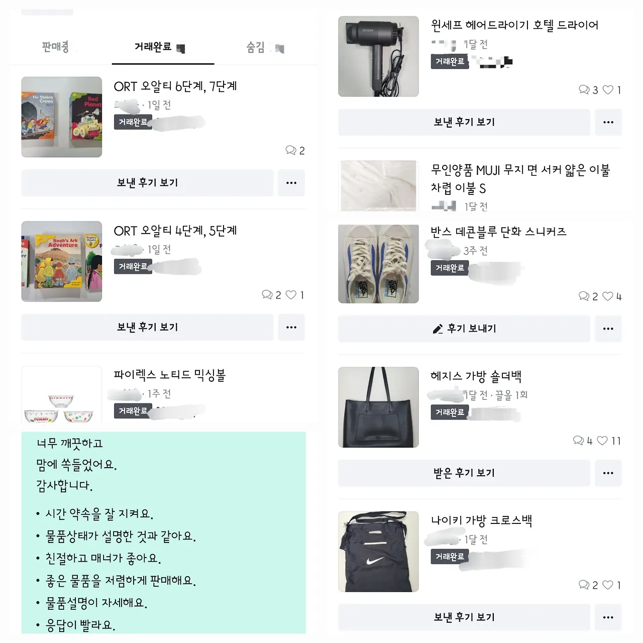 (상) 가방류를 살 때마다 받았던 더스트백을 잘 모아두었지만 사용할 데가 없어서 비웠다. (하) 아이의 작아진 겨울슬리퍼와 신지 않고 보관만 했던 나의 여름슬리퍼를 나눔 했다.비움의 마지막 방법으로는 이제는 전 국민의 온라인 중고마켓인 당신 근처의 마켓, 당근마켓을 이용하는 것이다. 원래도 당근마켓을 잘 이용해서 물건을 잘 판매했다. 여러 번의 이사를 거치면서 이사 갈 집에 맞지 않는 가구나 물건들을 당근으로 판매하면서 기분이 좋았는데, 최근에도 비움을 하며 당근마켓을 잘 이용하니 물건을 무작정 버리지 않고 필요로 하는 분들께 갔다는 생각에 뿌듯했다. 9월부터 시작하여 11월 초인 지금까지 10건의 거래를 했으니 부지런하게 움직여서 거래를 한 편이다. 판매가도 높지 않게 책정하고 깨끗하고 쓸만한 물건들을 내놓았더니 거래 후기도 좋아 어깨가 으쓱한 건 덤으로 얻는 기쁨이다.