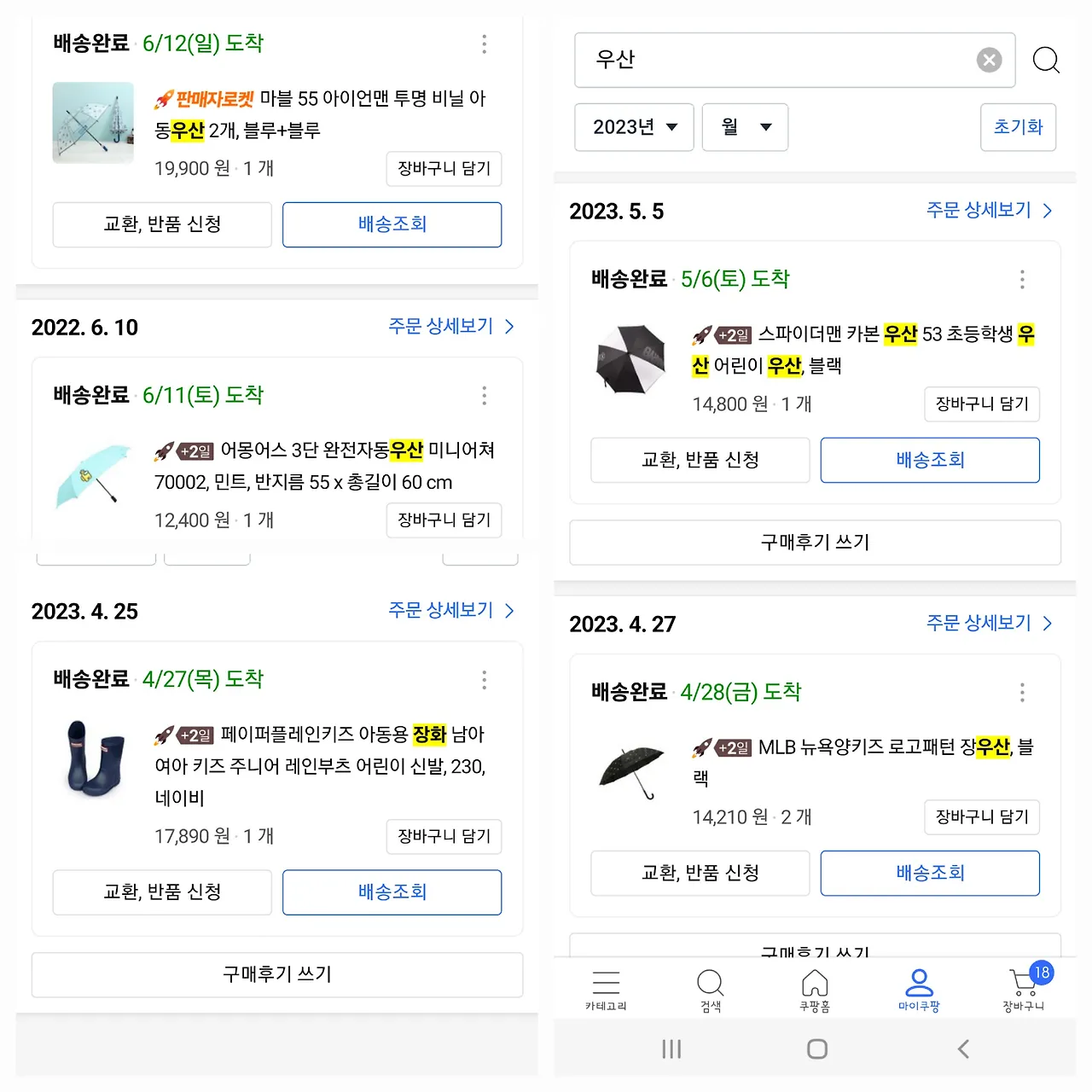 2년 새 주문한 우산과 장화. 둘째 장화는 물려받으면 되니 감사