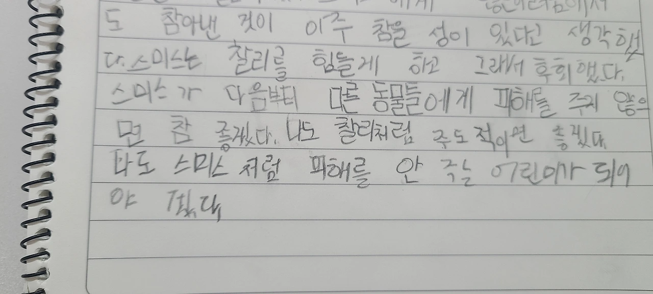 나도 찰리처럼 주도적이면 좋겠다. 그리고 스미스처럼 피해를 안 주는 어린이가 되고 싶다.