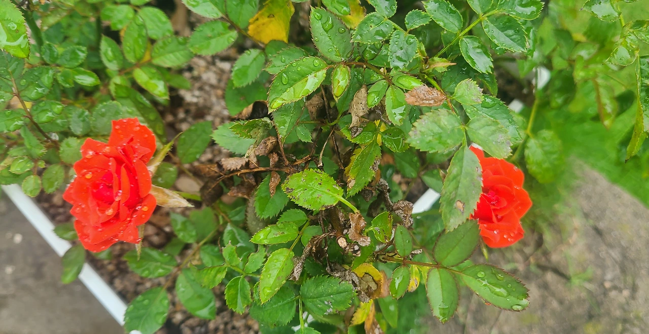 5월쯤에 장미 화분을 선물로 받았다. 그때도 장미가 끝물이지만 장미 화분으로 오래오래 두고 보시라며 선물을 주셨는데 그래도 5월은 장미가 만발하는 때니 예쁘게 감상하다가 장미가 다 진 뒤에도 텃밭 옆 한편에 잘 두고 물은 부지런히 주며 장미가 없는 장미화분을 두고 있었다. 잎도 벌레가 많이 먹어 그런지, 아님 직사광선을 너무 많이 받아서 그런지 많이 거뭇거뭇해서 장미에 대해 아무 지식이 없던 나는 내년까지 장미화분이 살아 있을지 걱정하고 있었다. 텃밭 식물과 함께 있는 듯, 없는 듯 자라나고 살아있었던 장미였는데, 어제까지만 해도 없던 꽃이었는데 오늘 아침에 보니 세상에나 뾰로롱 하고 장미꽃이 두 송이 피어나 있는 것이다.