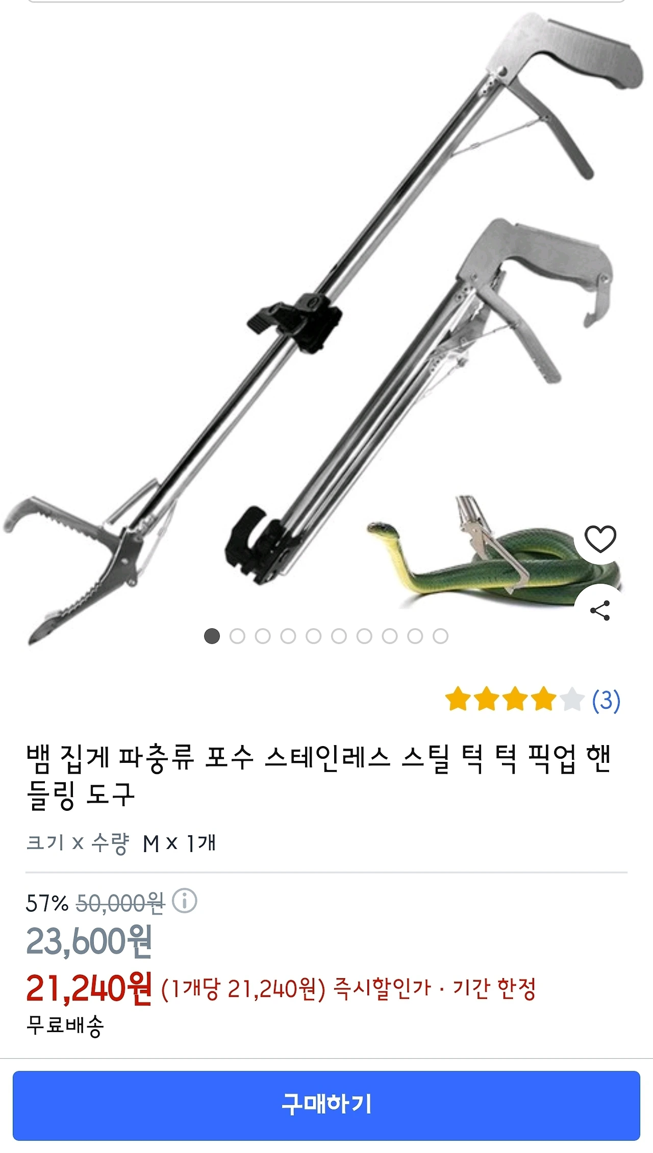 제대로 시골에 살고 있음을 체감하며 이제 뱀을 어떻게 잡고 퇴치해야 하는지 살펴보았다. 우선 뱀 잡는 도구가 있긴 하다. 쿠팡에도 파는구나. 어라? 로켓배송이 아니다. 그러면 배송되려면 3~4일은 생각해야 하니 이걸 어쩐담..