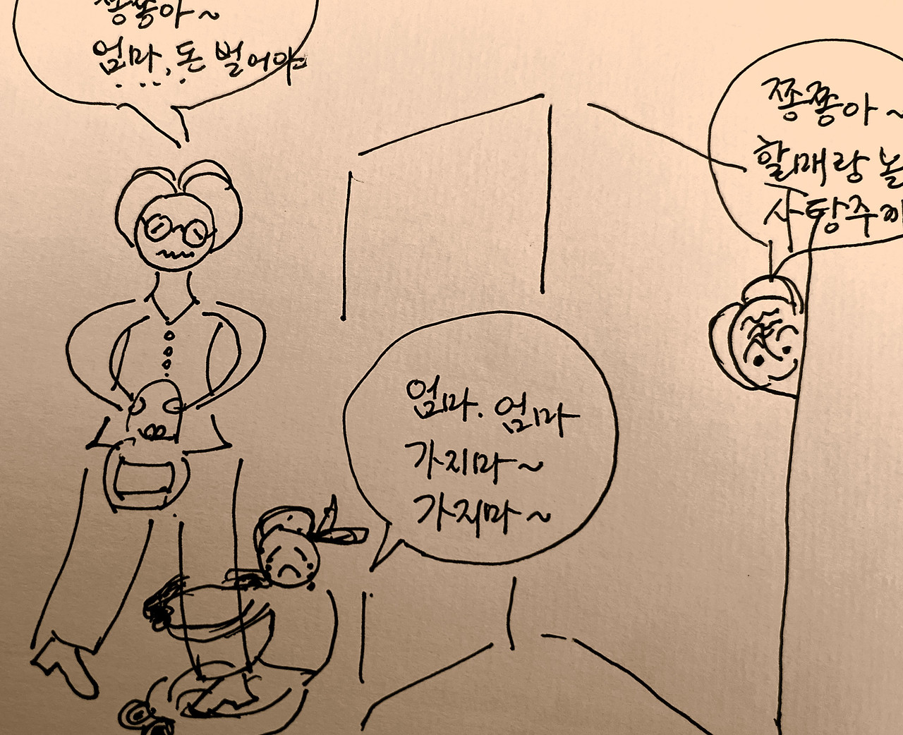 엄마가 돈벌어 와야지, 우리 쫑쫑이 좋아하는 과자도 사 먹고…