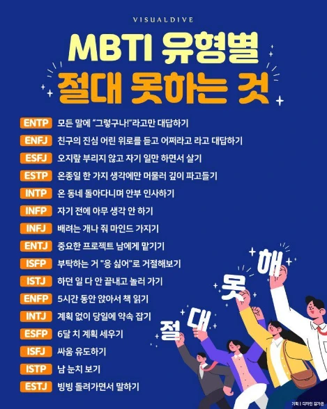요는 개성이 아주 분명하지 않은 보통의 사람은 자기 자신을 자기도 잘 모른다는 것이다. 뭐.. 스스로 생각하기에 이런 것도 같고 저런 것도 같고, 그러다보니, 대체로 어떤 성격적 경향을 갖는것 같다는 참고사항 정도의 결과 아닐까 싶다. 그러니 누군가 MBTI 유형 이야기를 꺼내면 어떨 때는 맞장구를 치고, 또 어떨 때는 괜히 편견 만들지마라고 한마디 하게도 된다. 그럼에도 불구하고, 우연히 발견한 MBTI 유형별 절대 못하는 것이라는 저 그림에서, 우리 가족 각자의 MBTI 유형을 너무나 잘 표현하고 있기도 해서, 놀랍다.