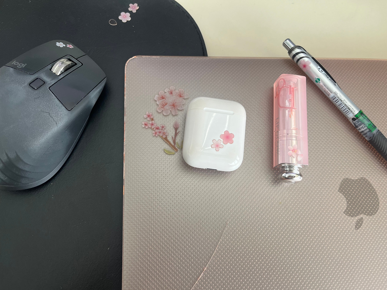 이처럼 고운 벚꽃 스티커가 붙어 있는 소소한 나의 애장품들, 애장품이라고 부르기에도 뭣한 작은 내 물건들을 이제 그냥 물건이 아니라 나의 일부이기도 한 듯. 그러니까 말하자면, 나의 개인 브랜드는 '벚꽃'이고, '벚꽃 스티커'를 붙여서 내 브랜드를 나타낸다고나 할까?