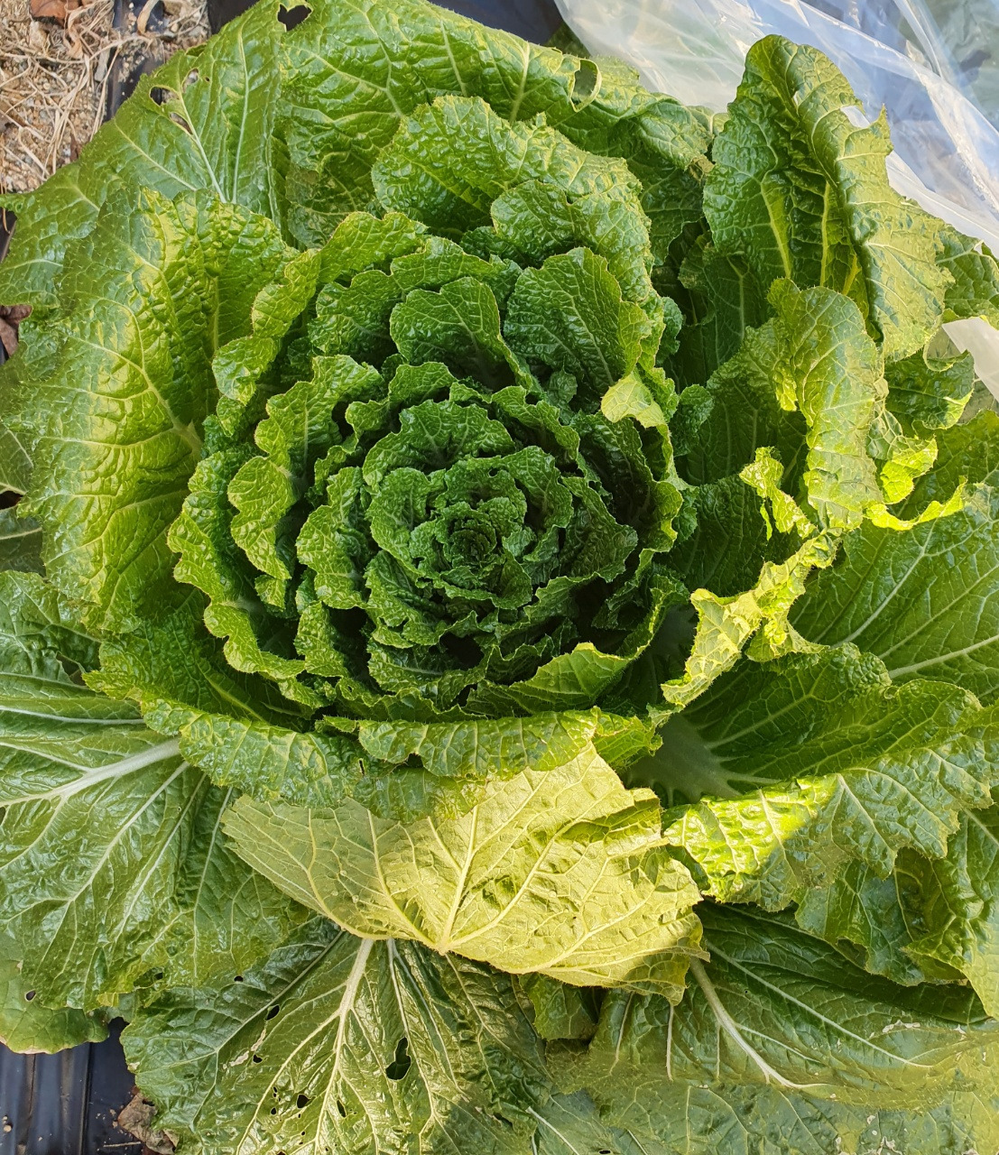 그러나 뒷마당 텃밭의 배추는 이 추위에도 이파리를 활짝 펼치며 살아있다. 심어놓은 무는 모두 수확해서 뭇국, 무김치로 맛깔스럽게 먹었는데, 김장 패스를 선언한 올해, 배추는 활용할 방도를 찾지 못하고 내내 방치해 두다가 서리를 맞아 얼고 있기에 며칠 전 비닐로 덮어두었었다.