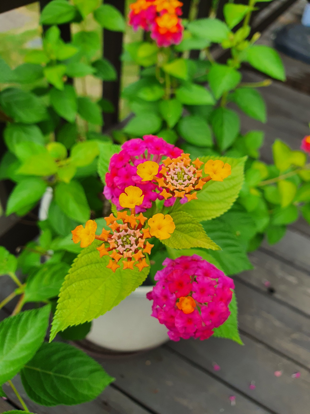 란타나는 세 가지 색 꽃이 피는데, 사진으로 보면 노란색, 주황색, 분홍색 꽃이 보인다. 월동을 하지 못한다고 해서 화분에 심어 밖에 내놓았다. 비에는 질소 성분 등이 있어 비를 맞는 게 성장에 더 좋기 때문에 지금은 비를 맞고, 겨울에는 화분째 안에 들여놓을 생각이다.