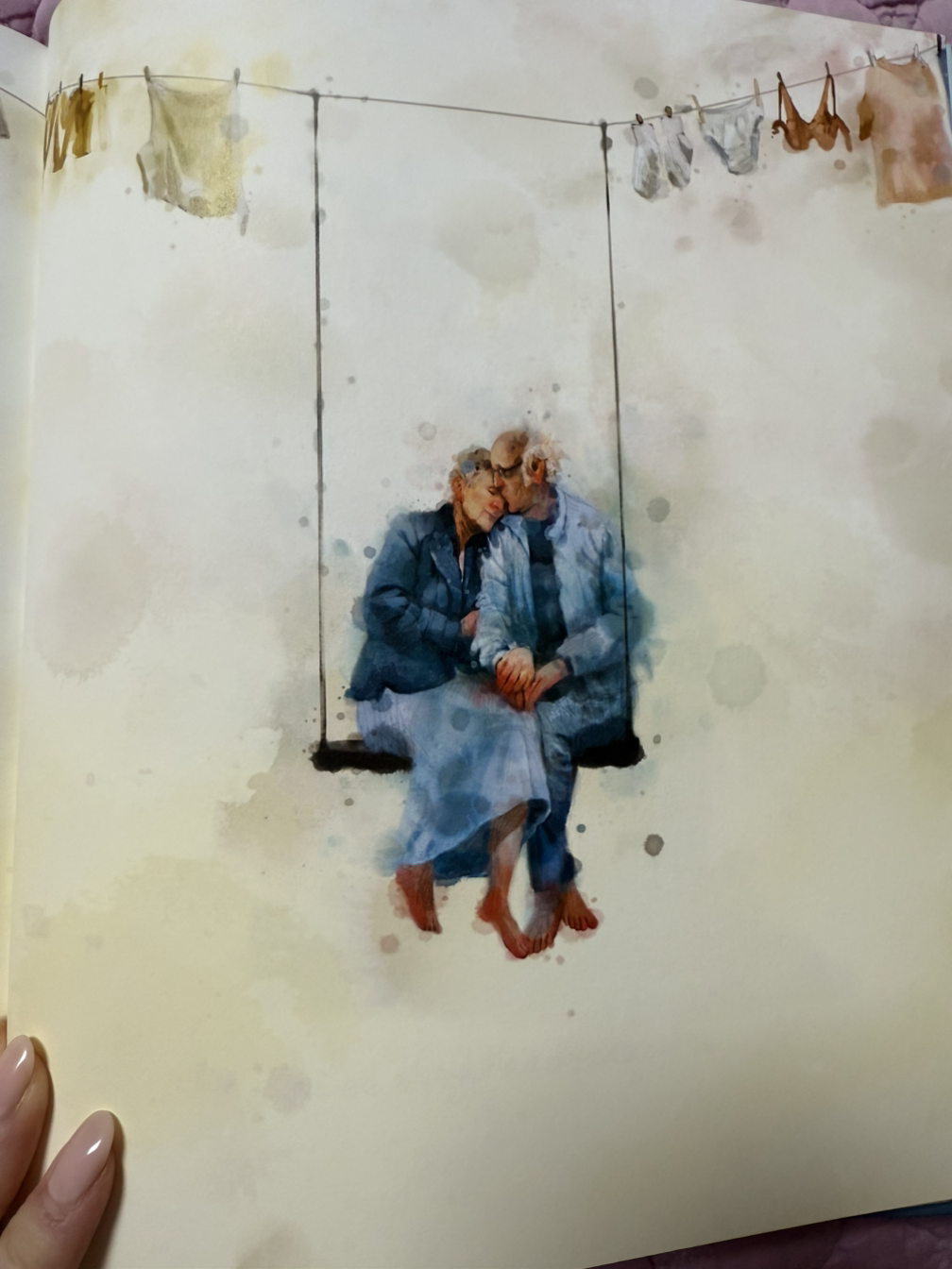 그런 의미에서 이 그림은 언제 끊어질지 모를 가느다란 빨래줄에 이어진 그네에 걸터앉은 노부부의 모습이 언제 이 세상과 이별해도, 생을 마감해도 이상하지 않을만큼 아슬아슬하고 위태롭지만, 그럼에도 불구하고, 두사람의 표정과 서로 기대고 있는 모습은 아무 설명 글도 없고, 소리도 없지만, 그야말로 말.없.이. 말해준다.