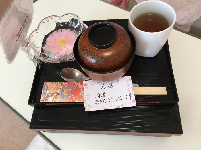 당연한 이야기지만 일본 병원에서는 산모에게 미역국을 주지 않는다. 산모라고 특별히 무언가를 챙겨 먹거나 혹은 가려먹기보다는 그저 골고루 영양소를 섭취하기를 권장했다. 한국에서는 산모에게 금기시되는 빵이나 면도 나왔고, 튀김 같은 기름진 음식이나 달달한 간식도 나왔다.