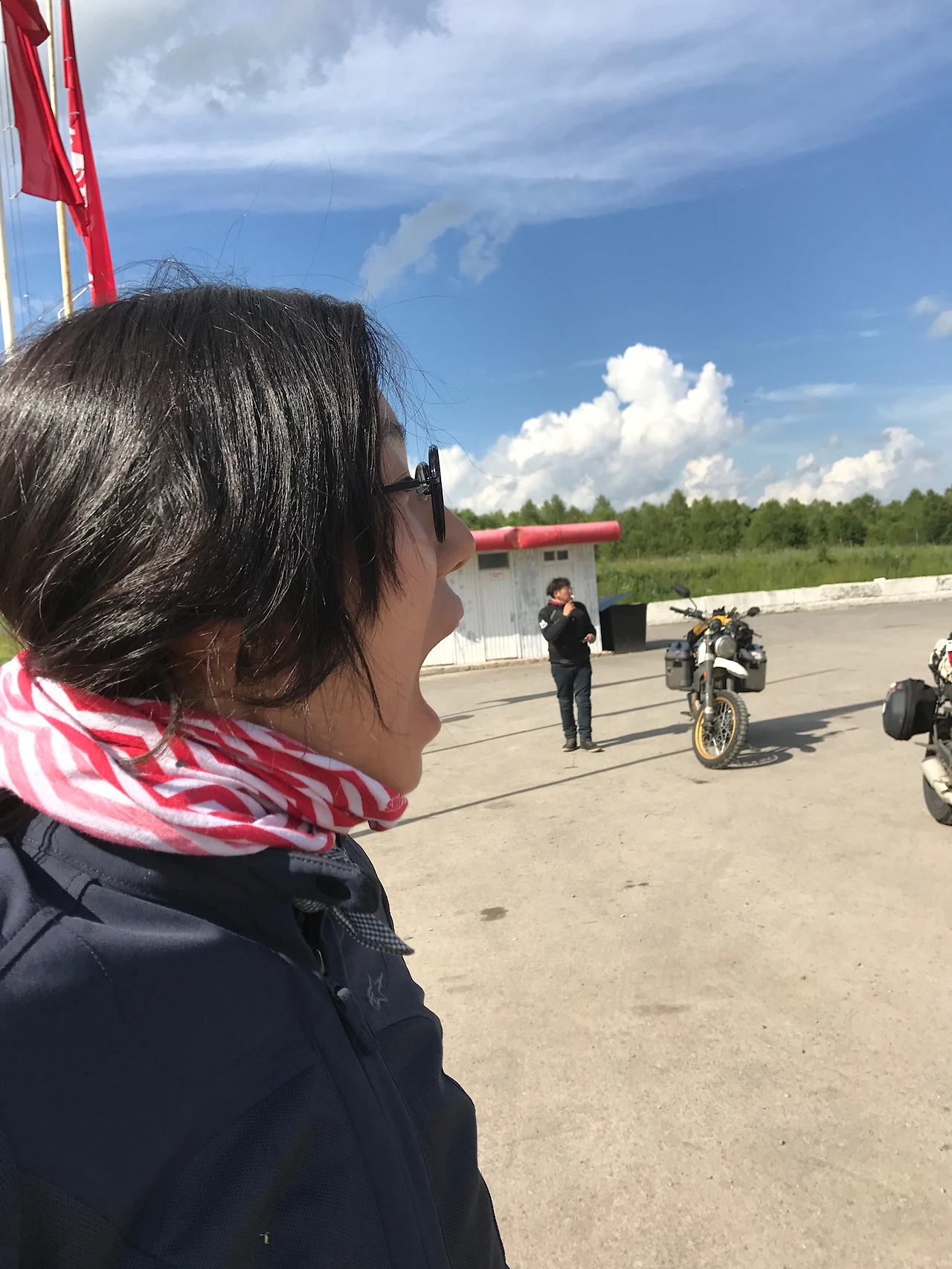 우리의 바이크 근처에 세대의 바이크들이 나란히 선다. 이윽고 헬맷을 벗고 세 명의 러시아 라이더가 나타난다. 거기에 여성 라이더의 등장이다.