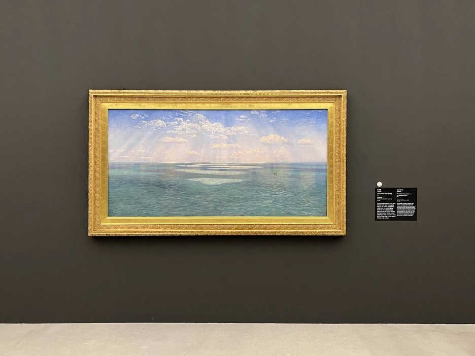 이번 전시 포스터의 작품이기도 한 존 브렛의 <도싯셔 절벽에서 바라본 영국 해협>은 전시장에서 가장 인기 있는 작품 중 하나다. 작품을 보고 있으면 바다의 냄새가 섞인 잔잔한 바람이 느껴지는 것 같은 기분이 든다. 가까이 다가가 보면 바다 표면에 부서지는 빛 하나하나를 정말 세밀하게 묘사되었고 바다 또한 수많은 종류의 파랑으로 메꿔진 것을 알 수 있다. 작가는 활동 초기에는 세밀한 묘사에 집중했고 후기로 갈수록 바다 풍경을 중점적으로 그렸다. <도싯셔 절벽에서 바라본 영국 해협>은 1870년대 그가 직접 영국 남부 해안을 항해하며 그린 습작들과 노트를 토대로 제작한 작품이다. 작가는 작품을 통해 정교한 바다의 모습뿐만 아니라 정서적인 측면까지 담아내고자 했다.