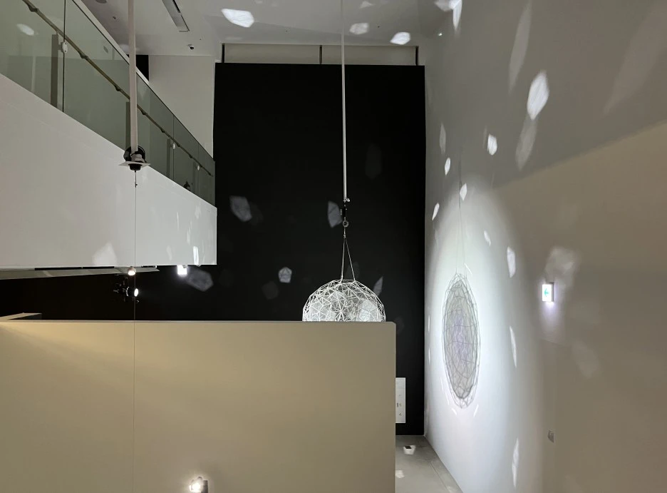 올라퍼 엘리아슨의 작품은 구체적인 설명보다 직접 작품을 보며 직관적으로 느끼는 것이 더욱 의미가 있을 것 같다. 구체 형태 위에 달린 진동추에 의해 작품은 천천히 회전하고 작품에 반사되는 빛이 벽면에 흩뿌려진다. 천천히 움직이는 구체와 빛 조각들을 바라보고 있으면 최면에 걸리는 듯한 기분이 드는데 작가는 바로 이런 빛의 심리학적 효과에 관심을 두었다. 그는 작품을 통해 빛과 색을 실험함으로써 우리가 공간을 인지하는 방식과 이에 따라 변화하는 감정을 끊임없이 실험한다.