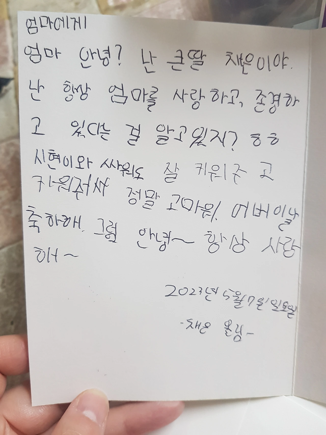 의젓하고 착한 첫째의 고마운 카드를 보자마자 올해도 울컥 눈물부터 터집니다. 사랑하고 존경한다니, 도대체 너에게 난 어떤 의미이길래....! 생각할수록 자식의 부모사랑을 따라잡을 순 없을 것 같습니다. 내가 한 거라곤 낳아주고 길러준 게 다인 거 같은데, 다른 이유 없이 단지 나라는 이유 하나로 사랑한다니.... 두 딸덕에 올해 어버이날도 부끄럽고 익숙해지지 않습니다. 올해 어버이날도 자격 미달인 채로 축하만 받게 되네요...